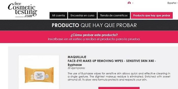 Como puedes comprobar en la imagen, en este caso, el producto de maquillaje que hay que probar son unas toallitas desquilates de ojos y rostro para pieles sensibles de la marca Byphasse.