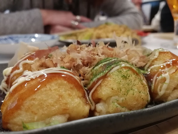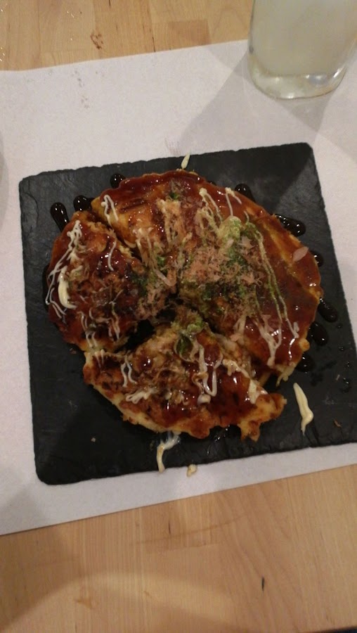 *De entrante unos Takoyaki de pulpo, unas bolitas a la plancha de huevo y harina relleno de pulpo con tempura crujiente de bonito seco y jengibre, de lo calientes que estaban se iba moviendo el bonito, jajaja, estaban ricas lo que el trasto imaginaba una textura tipo buñuelo osease frito y le desencantó un poco, a la plancha quedan cocidicas, pero estaban buenas el trasto se comió una Okonomiyaki de pollo, que es una pizza a la plancha, a base de col, huevo harina, con pollo, salsa Okonomiyaki, mayohesa, bonito seco y jengibre (lo mismo le pasó no le disgustó pero le faltaba un poquito de sabor y de pollo para su gusto, eso sí le encantó la salsa)