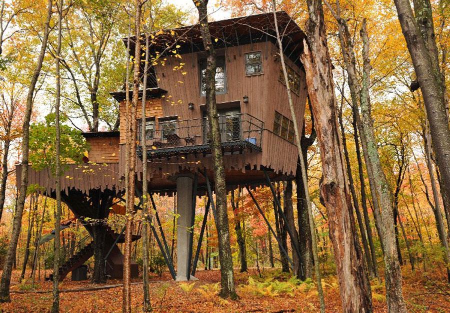 Fuente: Winvian Farm También en Estados Unidos encontramos Winvian Farm. Está en Litchfield Hills, Connecticut, a tan solo dos horas de Nueva York. Entre los alojamientos disponibles, todos ellos localizados en el corazón de una granja preciosa, en plena naturaleza, destaca especialmente Treehouse Cottage, una gran cabaña en las alturas, amplia y desahogada.
