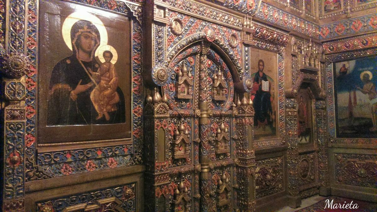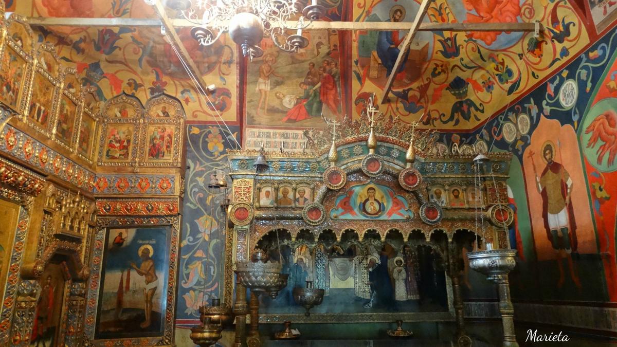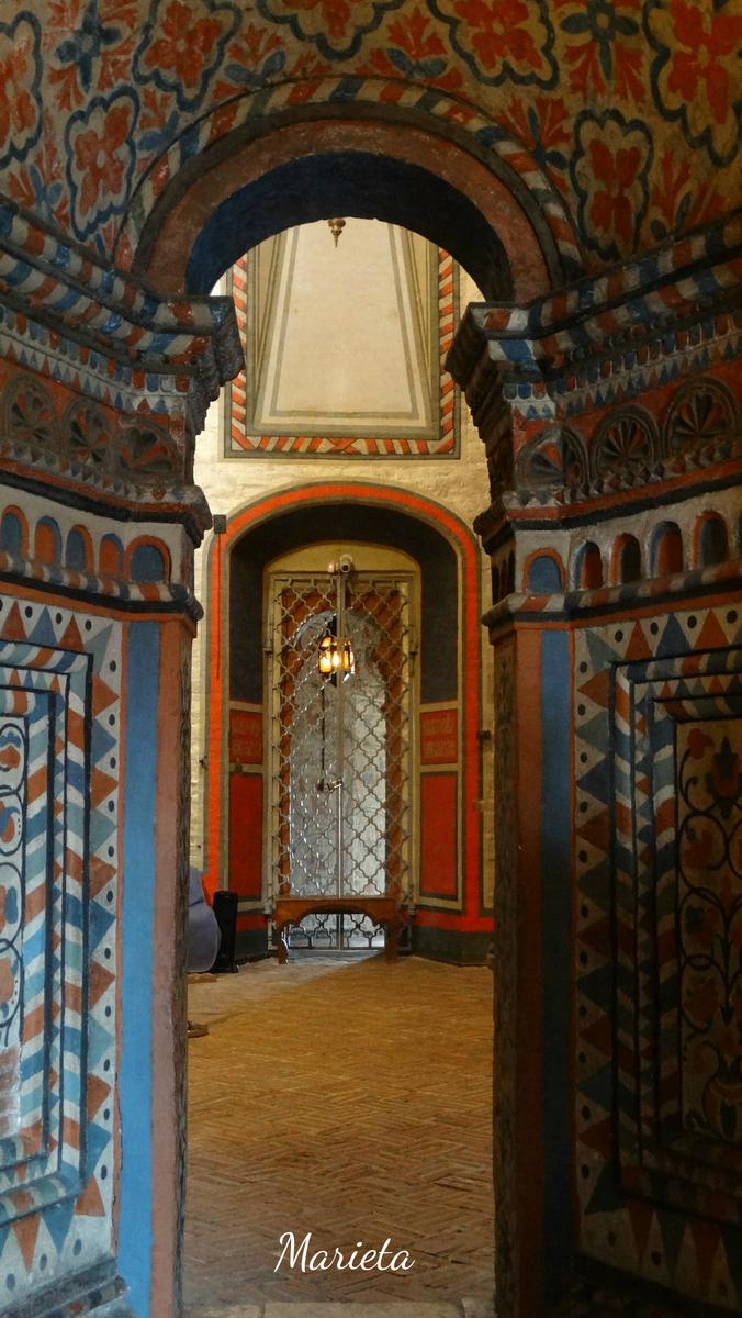 En su interior, de extrañas perspectivas y colores, visitamos las capillas y el alto campanario, que forman una planta de cruz griega inscrita en un cuadrado. Los frescos del siglo XVI que decoran sus paredes son una maravilla, así como sus cúpulas de sólidas y atrevidas combinaciones de nervios.