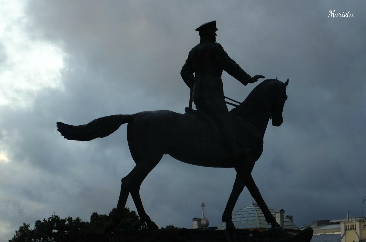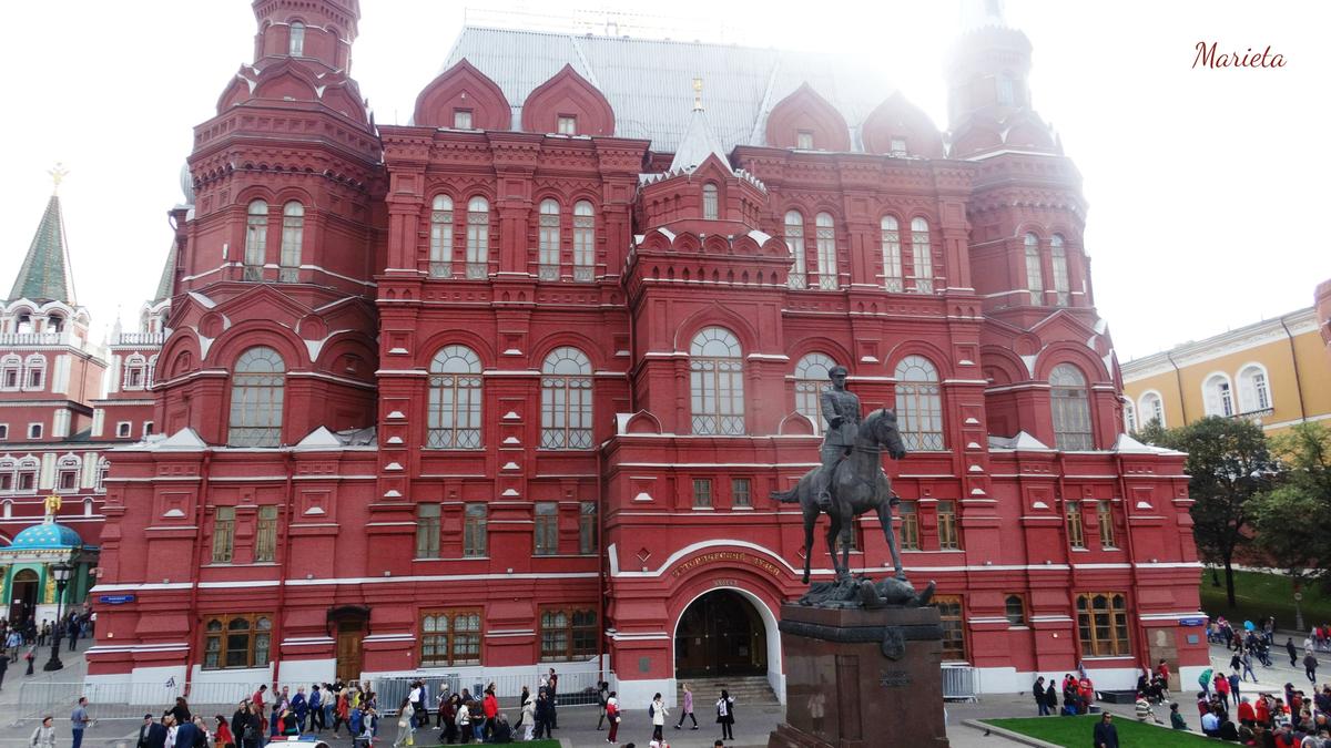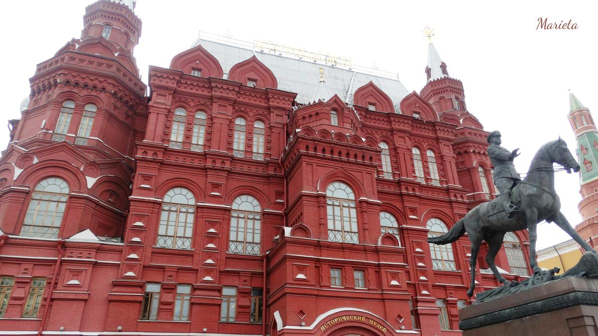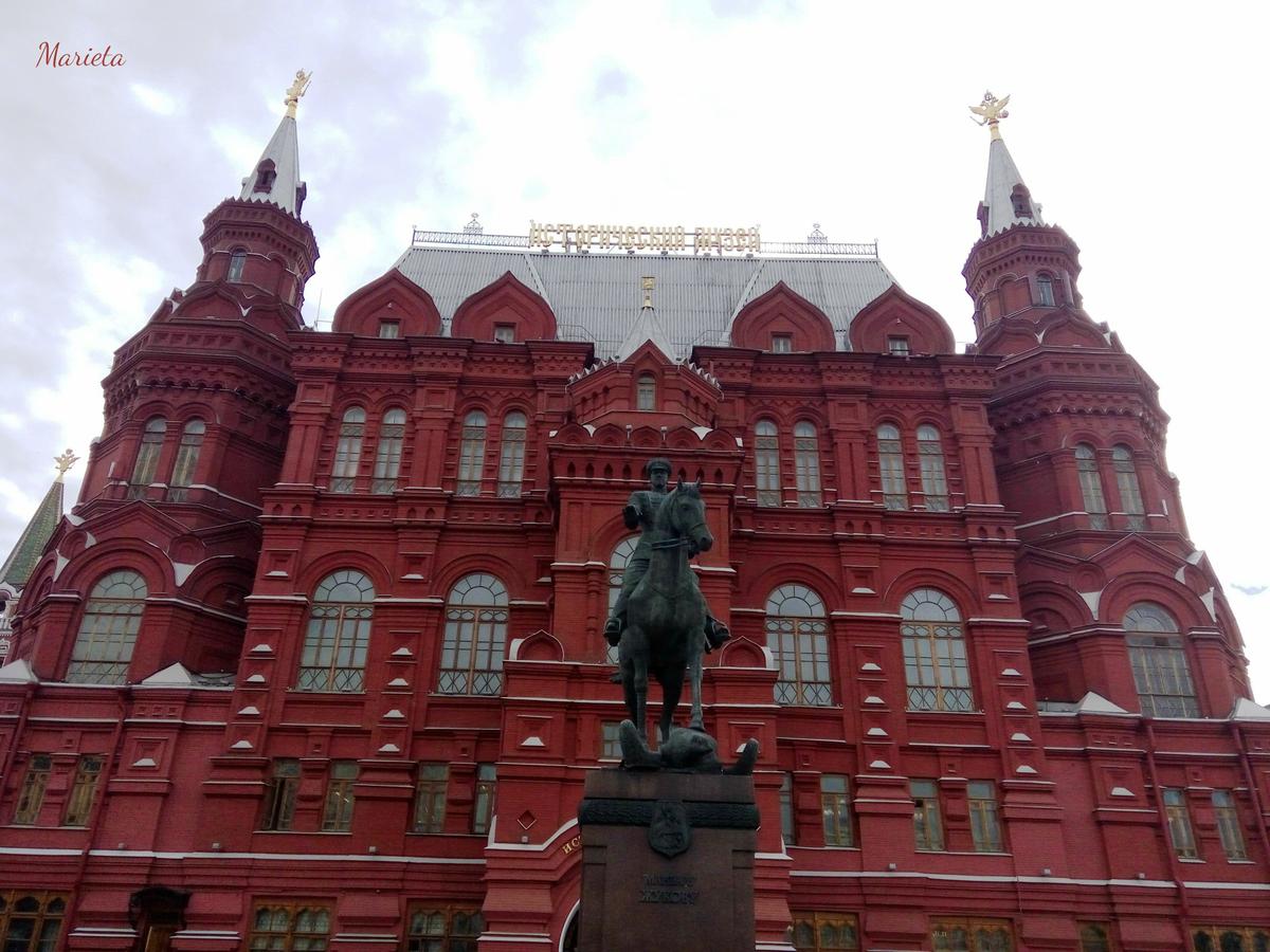 Llegamos a la Plaza del Manège y nos detenemos ante la estatua ecuestre del mariscal Zhúkov, a sus espaldas el imponente edificio del Museo Estatal de Historia.