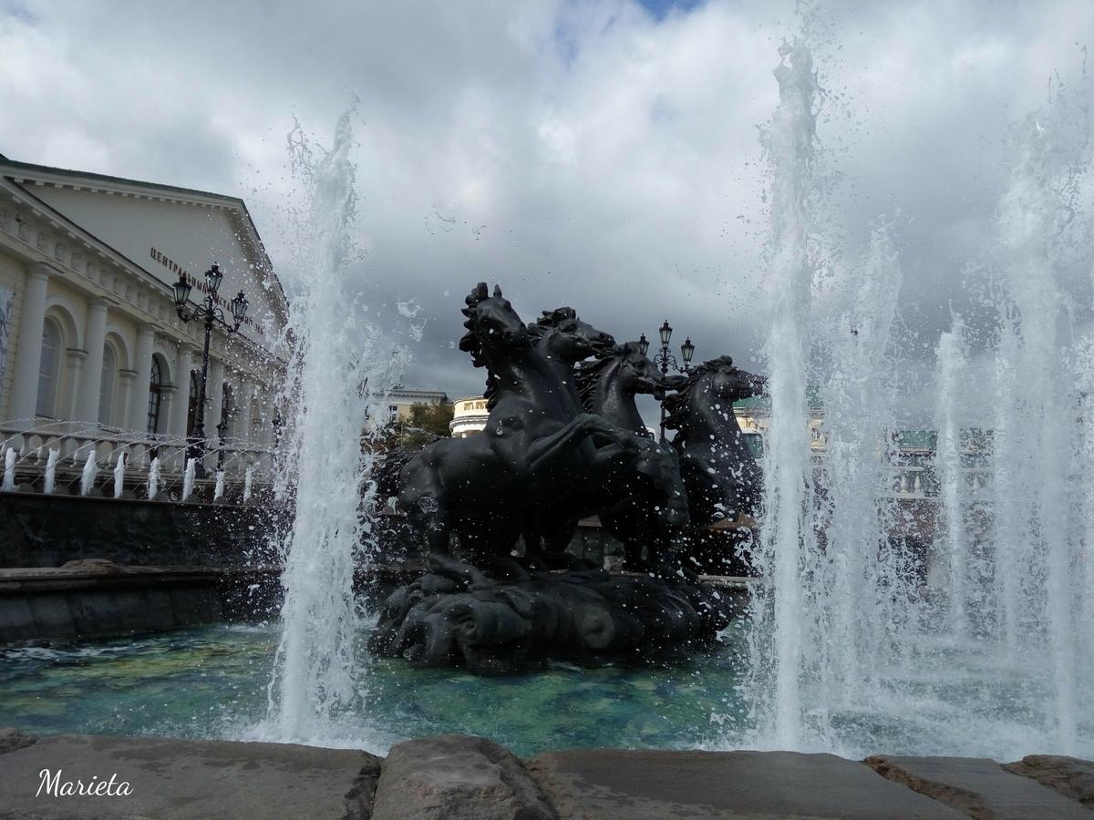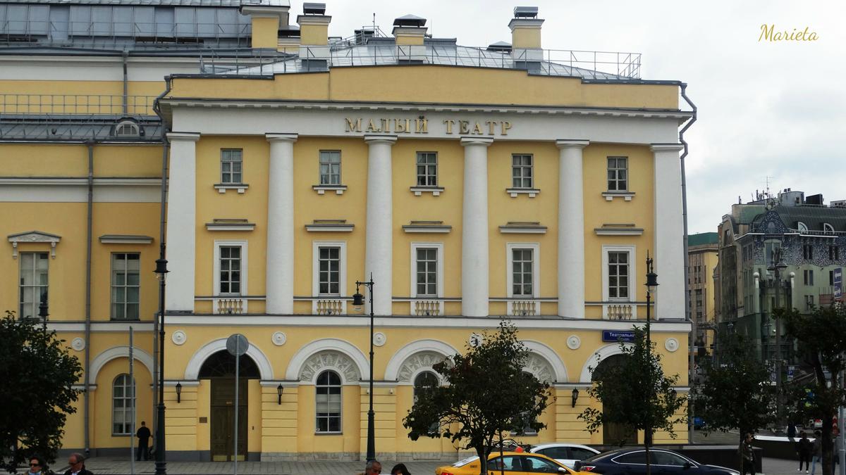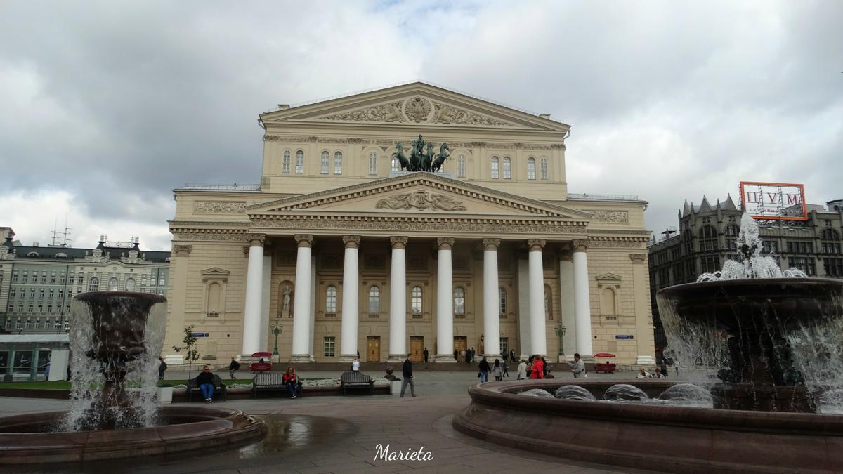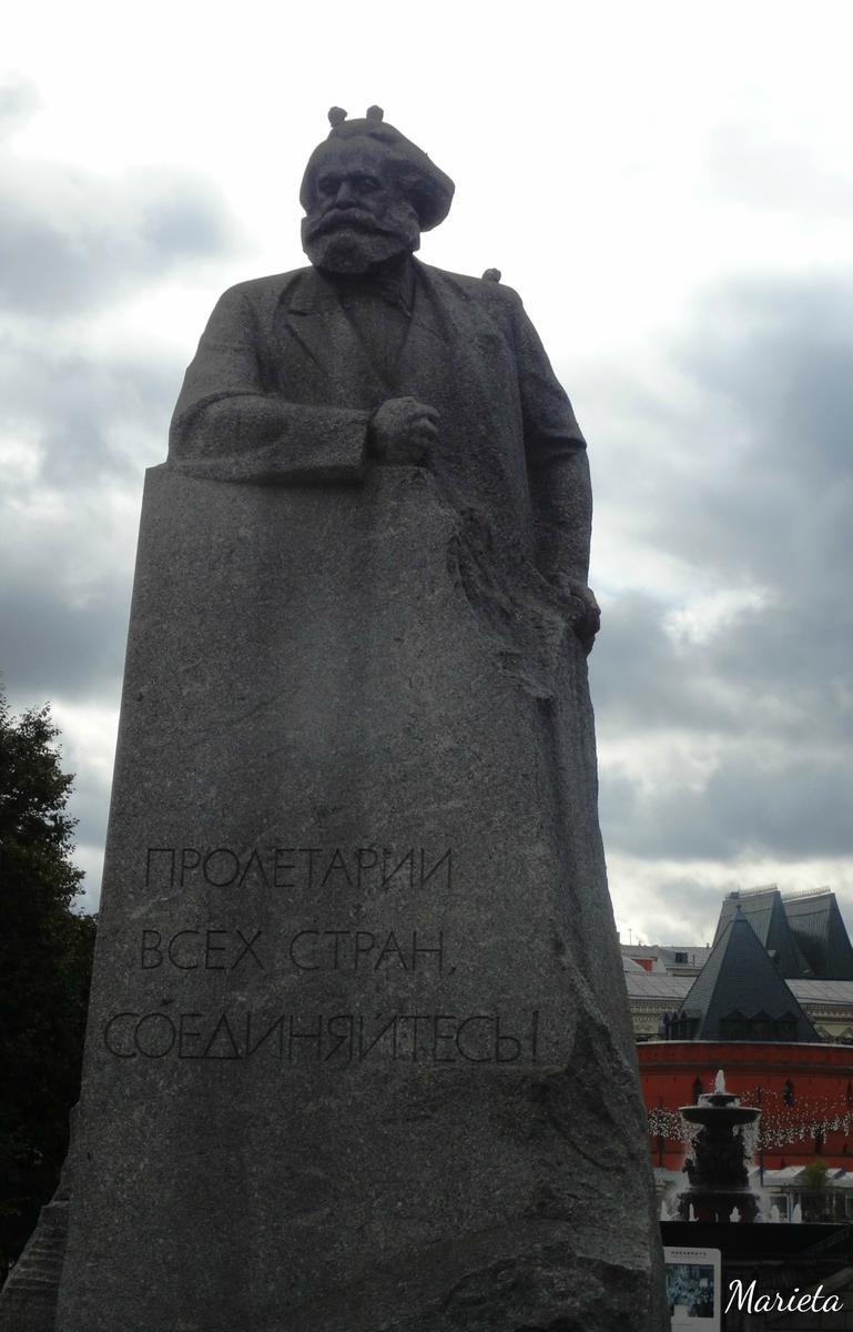 Dispuestos a apurar al máximo nuestro último día en Moscú, madrugamos para que la mañana nos cunda y nos dirigimos primero a la Plaza Teatral. Una de las plazas principales de la ciudad. Alrededor de ella se han construido dos de los teatros más importantes de Rusia. El famoso Bolshoi, el más célebre del mundo en cuanto a representaciones de ballet se refiere, construido entre 1821 y 1824. Y el teatro Mali, un precioso edificio construido en 1824 siguiendo el modelo del Teatro de la Comedia Francesa de París. El centro de la plaza está presidida por un busto esculpido en un solo bloque de granito de Carlos Marx. En la parte central del bloque se lee en ruso la consigna que se convirtió en lema internacional: ¡Proletarios de todos los países, uníos!