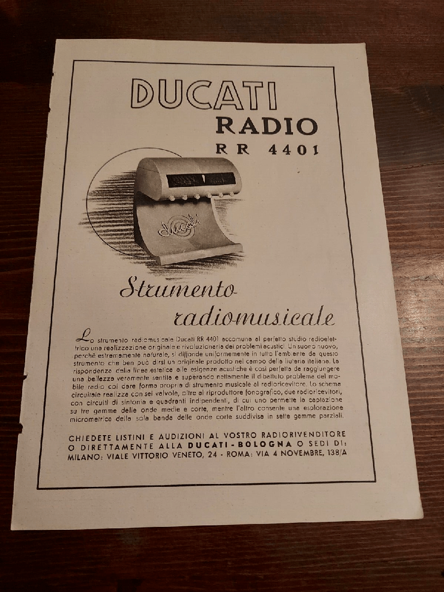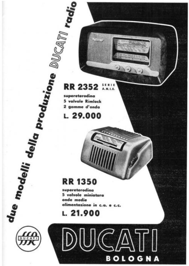 Durante unos años Ducati compaginaba la producción de radios con su apuesta en el mundo del motor, ganando fama mundial. Así en los años 50 todavía vemos modelos de radios Ducati en el mercado, que seguían destacando por su calidad y su cuidado diseño.Son radios altamente coleccionables por ser Ducati, por su diseño, y porque dejaron de fabricarse en los años 50.