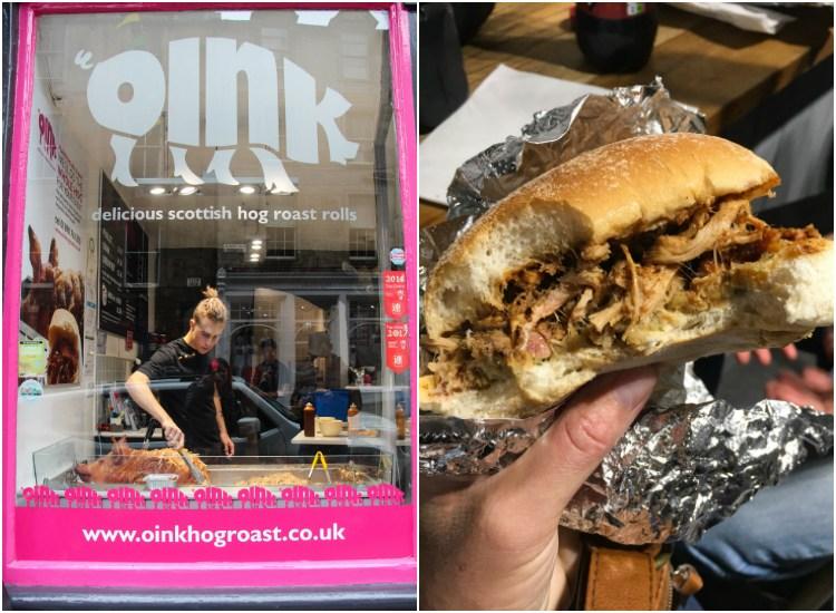 Oink (34 Victoria St, EH1 2JW) un local de sándwiches (bocadillos) de cerdo para llevar. Son simples, baratos y deliciosos. Perfecto para bolsillos ajustados o si quieres una comida rápida al paso. Aprox 6 pp
