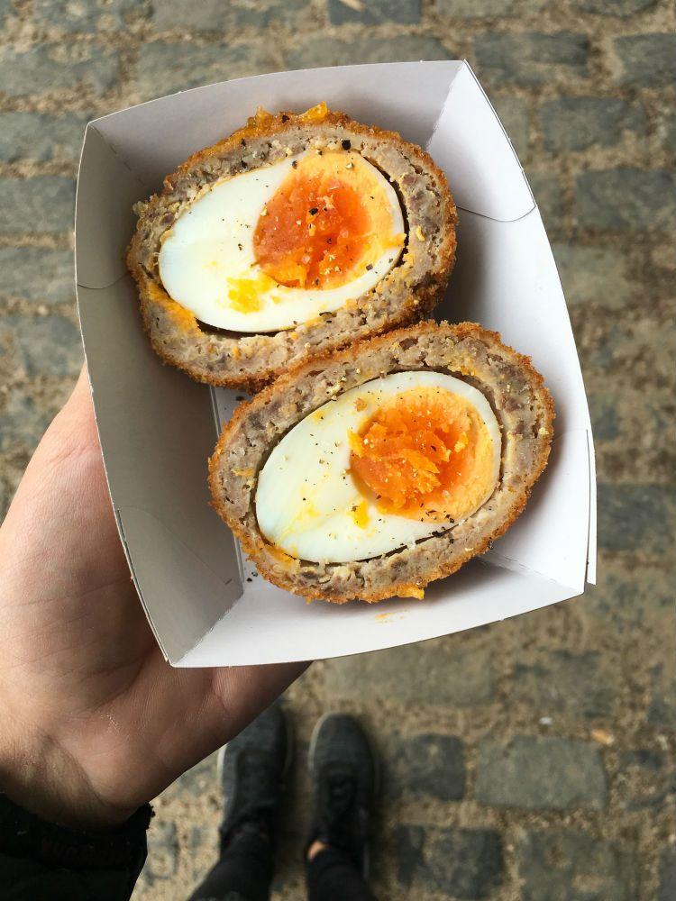 El scottish eggs (huevo a la escocesa) es un huevo duro rebozado en una mezcla de embutido (haggis,cerdo u otro) pasado por pan rallado y frito. Su origen se remonta a 1738 en una tienda de Londres.