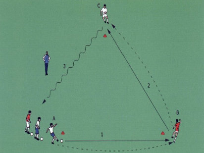 Las distancias variaran en función de la edad de los jugadores y del dominio del balón que tengan. Y el entrenador les tiene que insistir mucho en realizar fintas antes de recibir el balón.