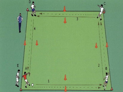 Para el desarrollo del ejercicio necesitaremos únicamente cuatro conos para delimitar el espacio requerido, y un balón. Participan tres jugadores dejando libre una de las esquinas.