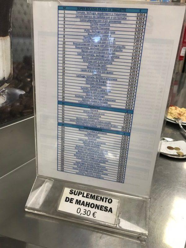 La carta contiene una gran cantidad de bocadillos que lo primero que te llama la atención es que el precio esta un poco subido. Curioso que te cobren el sobre de mahonesa a 30 céntimos, para mi es un poco cutre.
