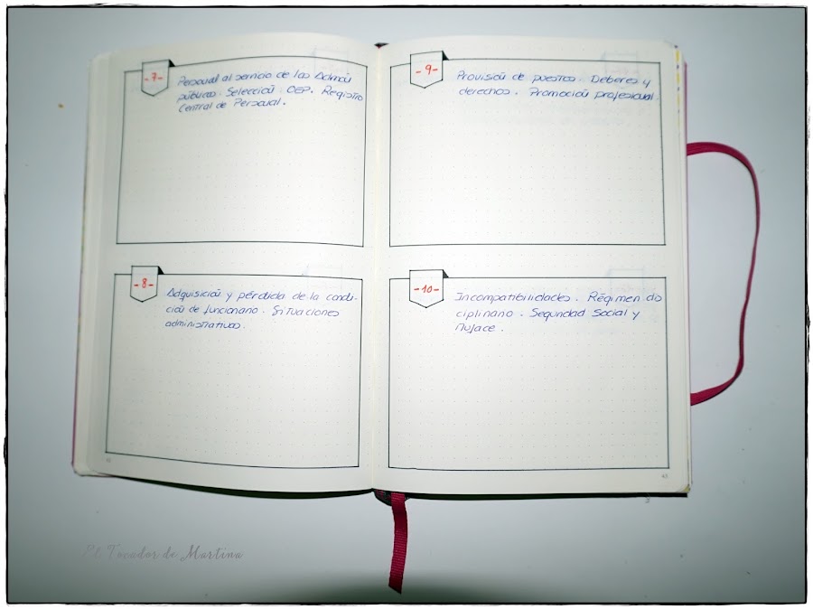 Como la mía está enfocada al estudio me he hecho unos cuadros en blanco por cada tema donde puedo ir anotando diversas cuestiones:
