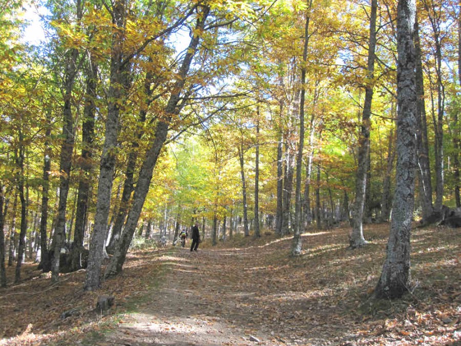 Volvemos al camino. Justo en ese momento, con las sombras marcando el medio día, mi hermano saca una cuña de queso de la mochila. Aunque el picoteo de alguna que otra castaña ha saciado ligeramente nuestro apetito, podréis imaginar lo bien que hemos recibido ese queso y es que en el campo todo sabe a gloria. Lástima que no habíamos contado con llevar la comida porque a continuación llegamos a un calvero, una pradera en la Ladera de Garrido, donde muchos excursionistas ya se han instalado para disfrutar de un merecido tentempié.