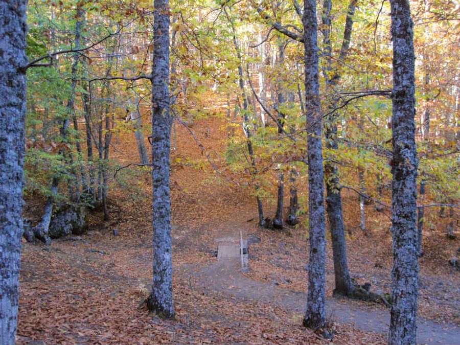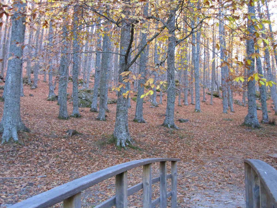 Superadas las tablas de la pasarela, nos recibe una soldadesca de esbeltos y solemnes castaños cargados de ocre, con una ligera neblina azulada, casi imperceptible para la cámara, enganchada a sus pies, y un débil sol que a duras penas se filtra entre sus hojas... La ruta, desde luego, promete ser espectacular.