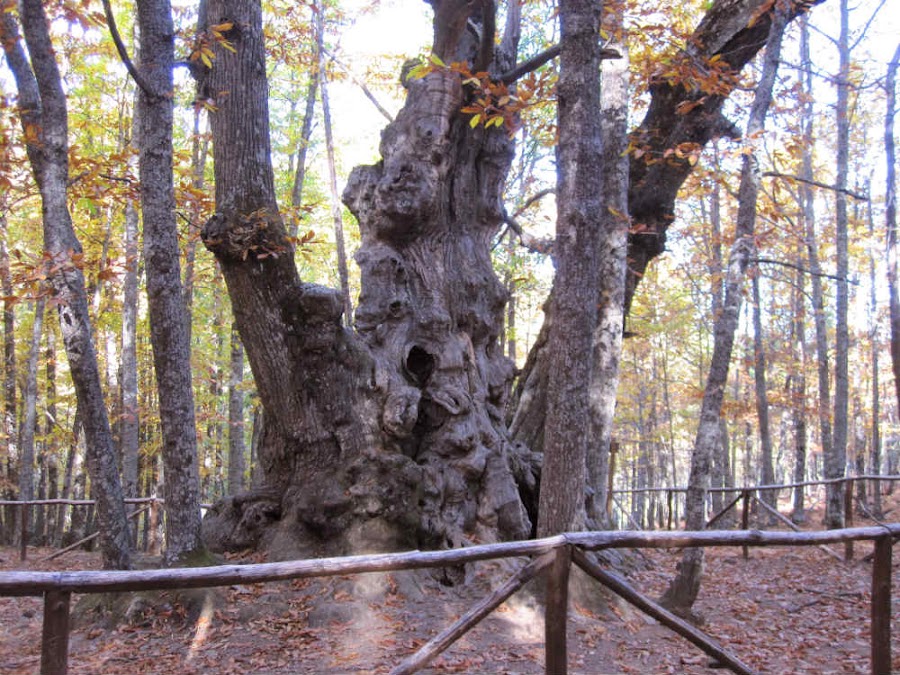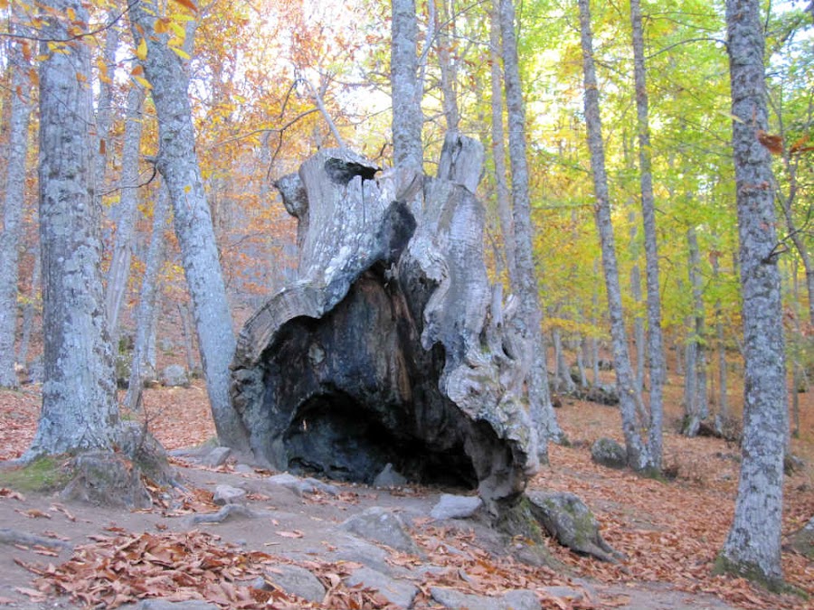 El Abuelo es el castaño más mimado de todo el bosque. Un cartel nos cuenta que roza los 600 años y que cuenta con unos 19 metros tanto de altura como de perímetro. Y, a pesar de haber sufrido los daños de alguna hoguera, varias ramas y los brotes que lo coronan le convierten en una auténtica leyenda. Sorprendidos no podemos evitar refugiarnos en su tronco hueco como ya lo hicieron, tiempo atrás, muchos pastores para protegerse de las inclemencias del tiempo.
