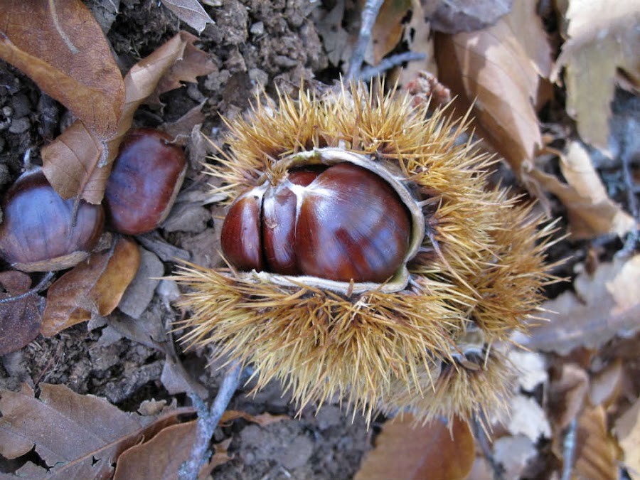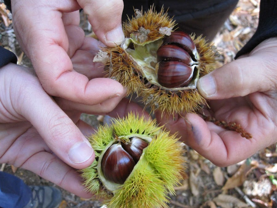 No vamos con la intención de recoger castañas, pero a un paso de las Navidades no podemos resistir la tentación de llevarnos algunas para usarlas en las compotas de fruta y para acompañar algunos guisos o, simplemente, asarlas. A estas alturas la ilusión se incrementa y andamos todos desperdigados entre los castaños con el espinazo doblado y emitiendo exclamaciones del tipo: "¡¡Mirad éstas que he cogido... que gordas!!". Desde luego es una ruta ideal para hacerla en familia. Su dificultad es baja y, como hemos podido ver, a los niños les encanta.