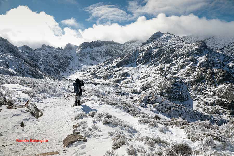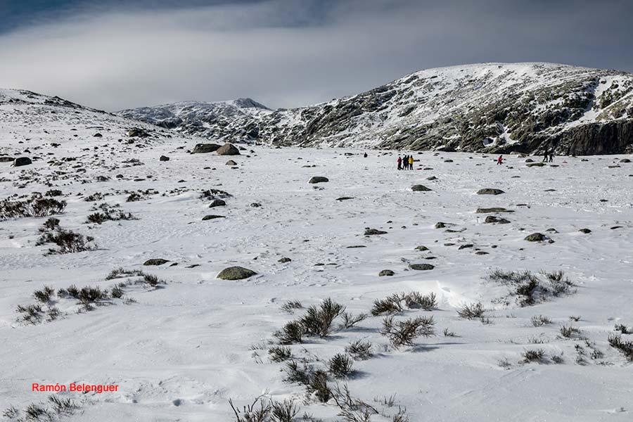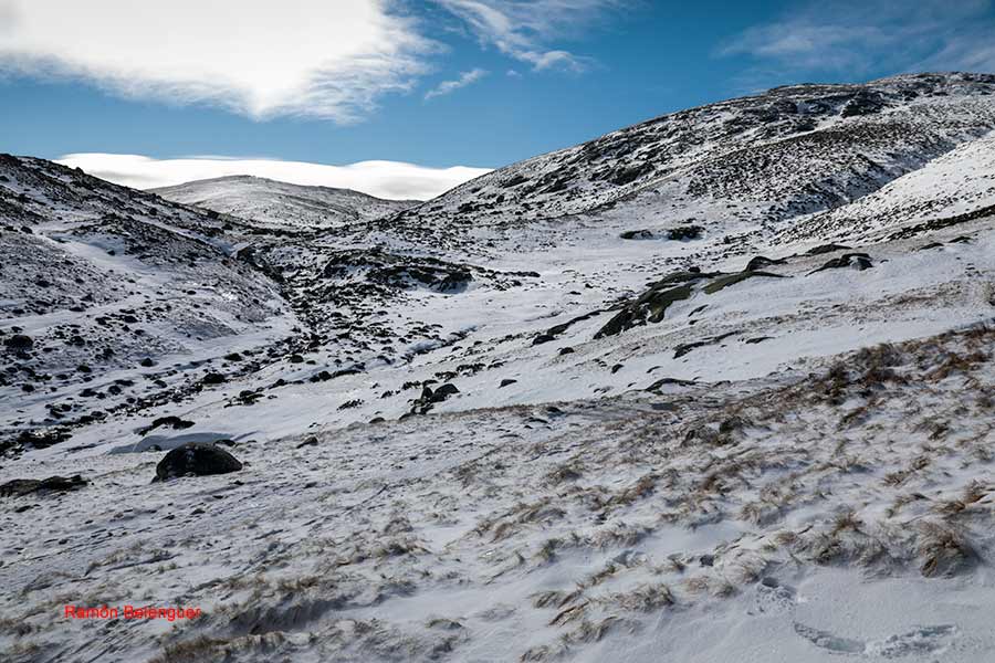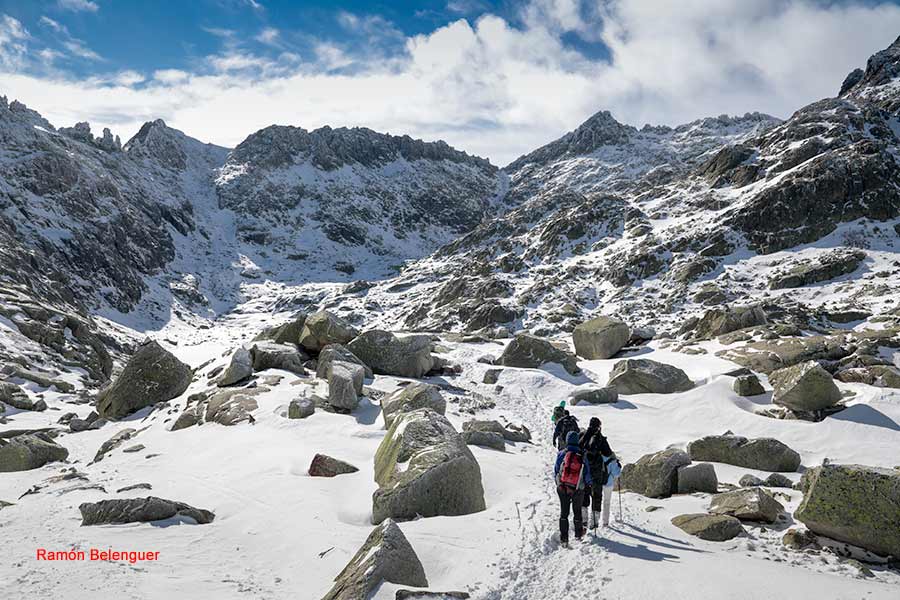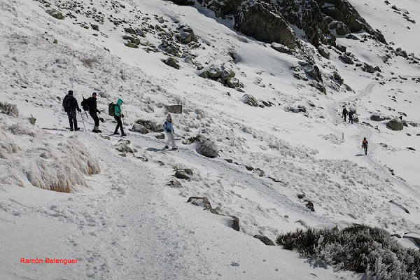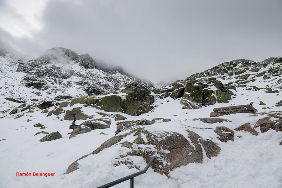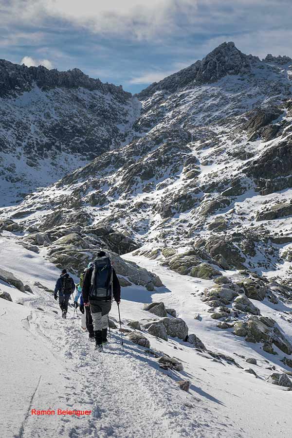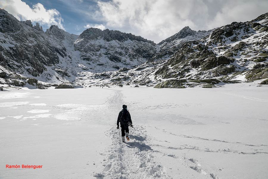 En los Barrerones, alcanzamos la parte más alta del recorrido (2.170 m.)donde nos encontramos con una espectacular panorámica del Circo de Gredos con la Laguna Grande en el fondo, de izquierda a derecha, de Este a Oeste, podemos identificar al Morezón (2358), el cuchillar de Cerraillos, el perro que fuma (parece una cara de un perro de perfil con una pipa en el morro), los tres hermanitos, el peñón del casquerazo (2467), el cuchillar de las Navajas, el Pico Almanzor y el Ameal de Pablo. la Galana (2568) y el Venteadero. A partir de aquí la senda desciende hacia el circo pasando por la fuente de los Barrerones ". Al hacerla en invernal y estar helada la atravesamos hacia el refugio de Elola, sino la bordearíamos por la izquierda. Si el nivel de la laguna está muy elevado hay un paso equipado en la zona más problemática.