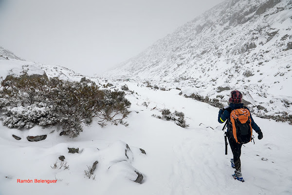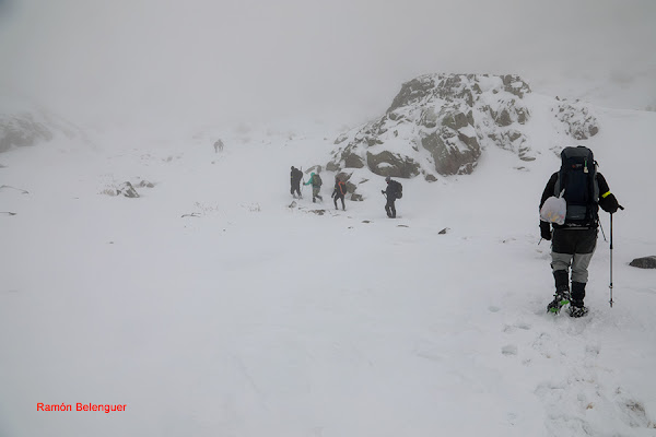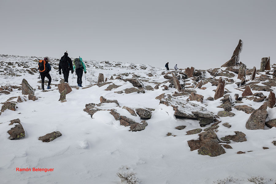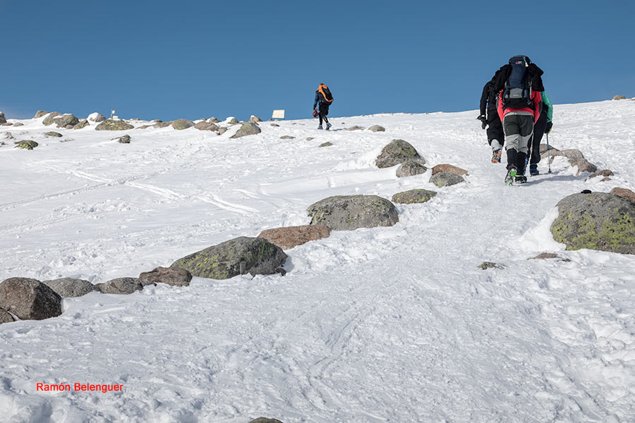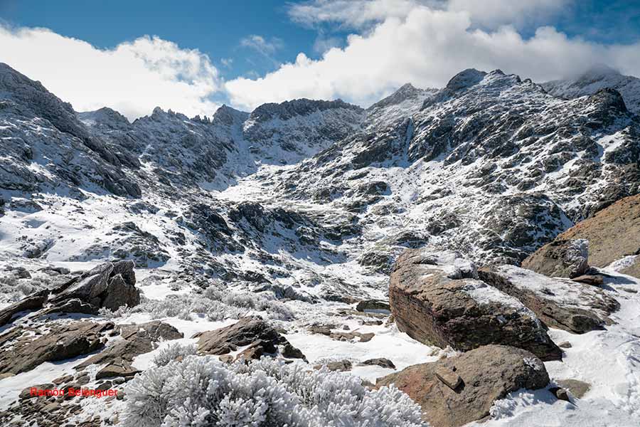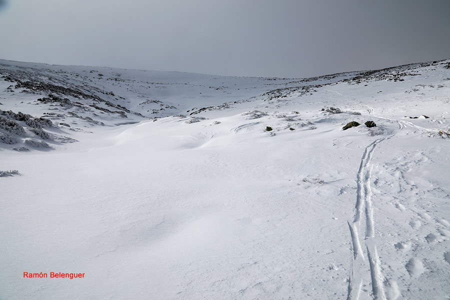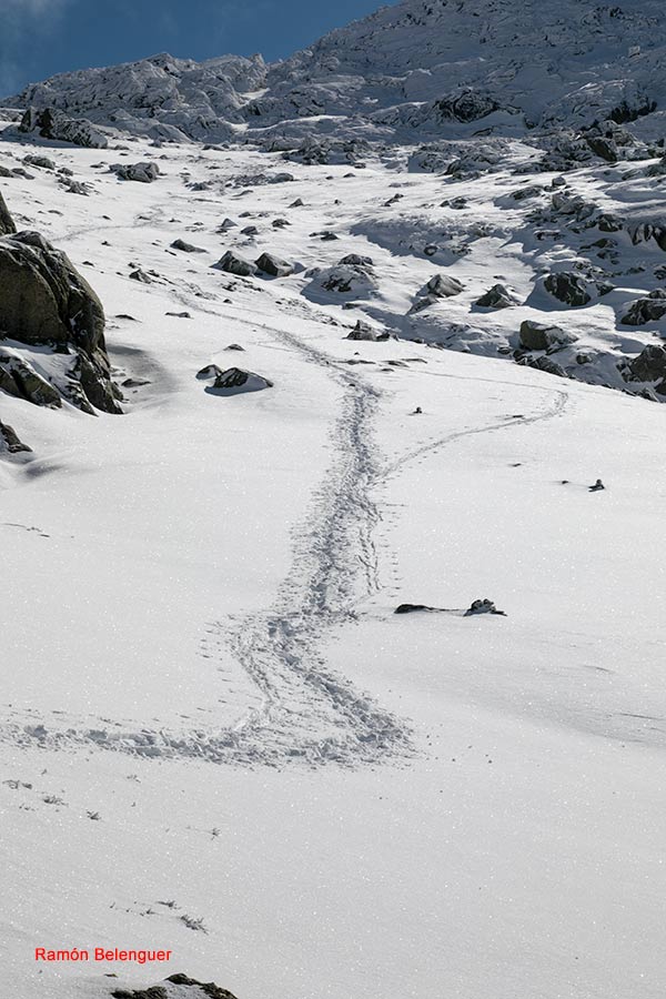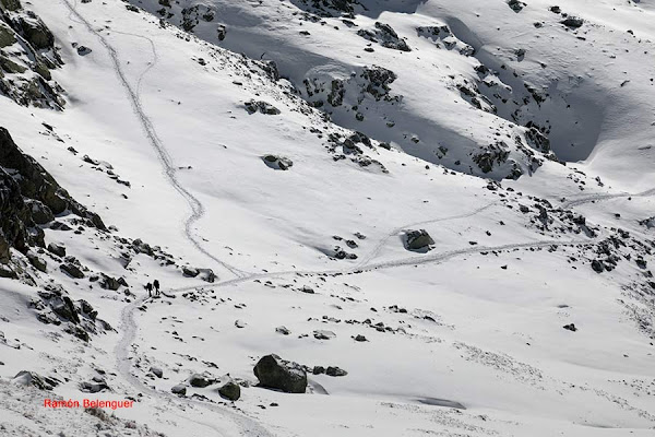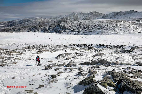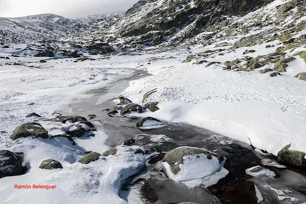 En los Barrerones, alcanzamos la parte más alta del recorrido (2.170 m.)donde nos encontramos con una espectacular panorámica del Circo de Gredos con la Laguna Grande en el fondo, de izquierda a derecha, de Este a Oeste, podemos identificar al Morezón (2358), el cuchillar de Cerraillos, el perro que fuma (parece una cara de un perro de perfil con una pipa en el morro), los tres hermanitos, el peñón del casquerazo (2467), el cuchillar de las Navajas, el Pico Almanzor y el Ameal de Pablo. la Galana (2568) y el Venteadero. A partir de aquí la senda desciende hacia el circo pasando por la fuente de los Barrerones ". Al hacerla en invernal y estar helada la atravesamos hacia el refugio de Elola, sino la bordearíamos por la izquierda. Si el nivel de la laguna está muy elevado hay un paso equipado en la zona más problemática.