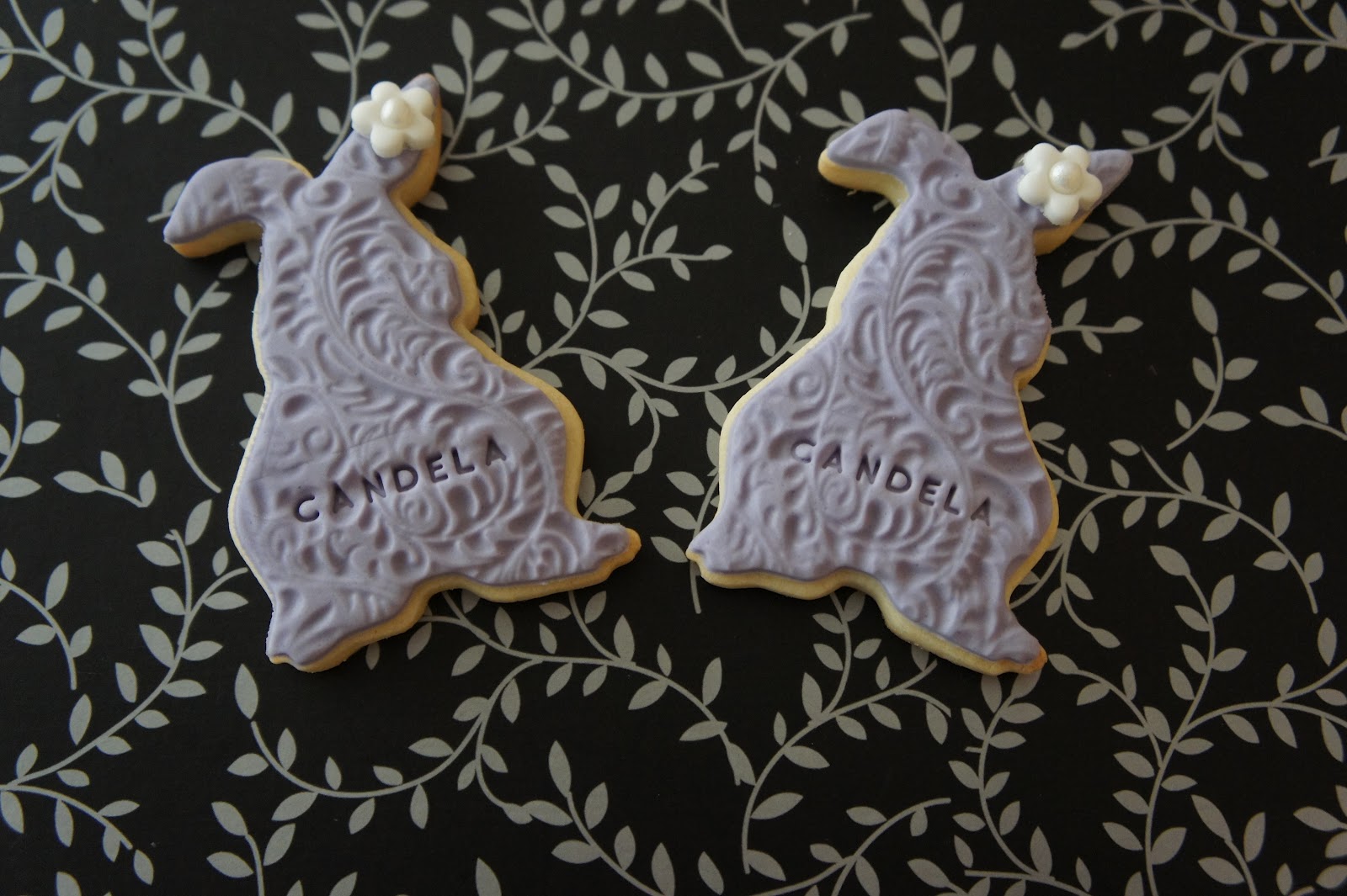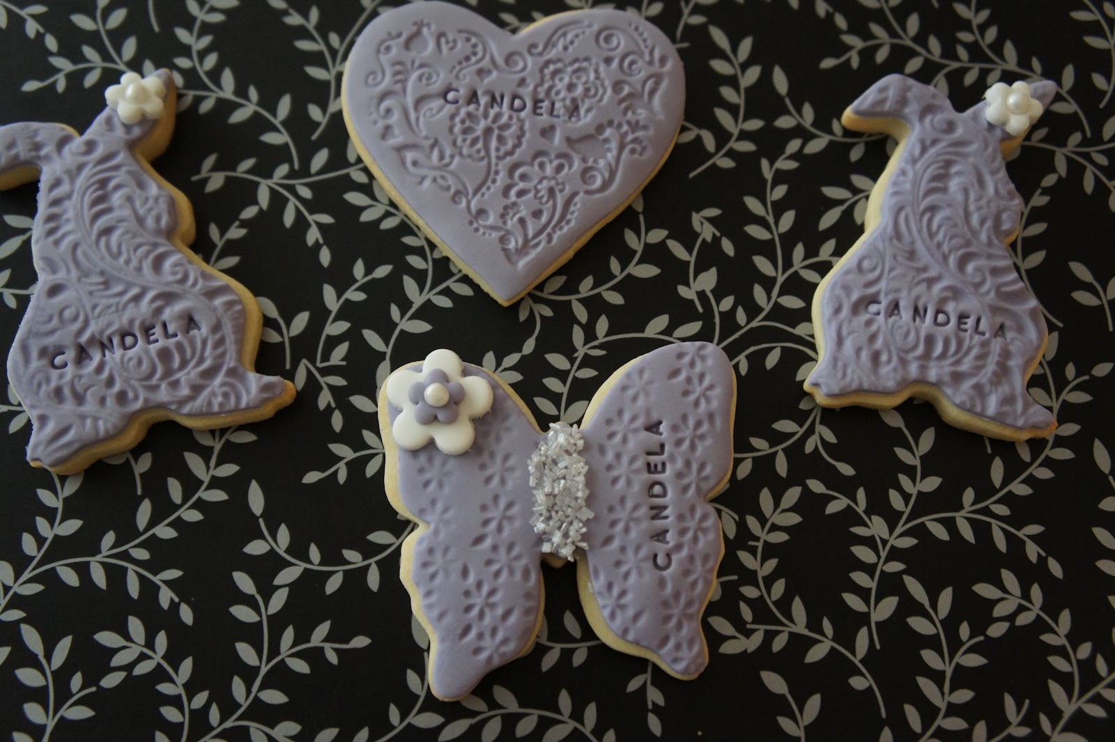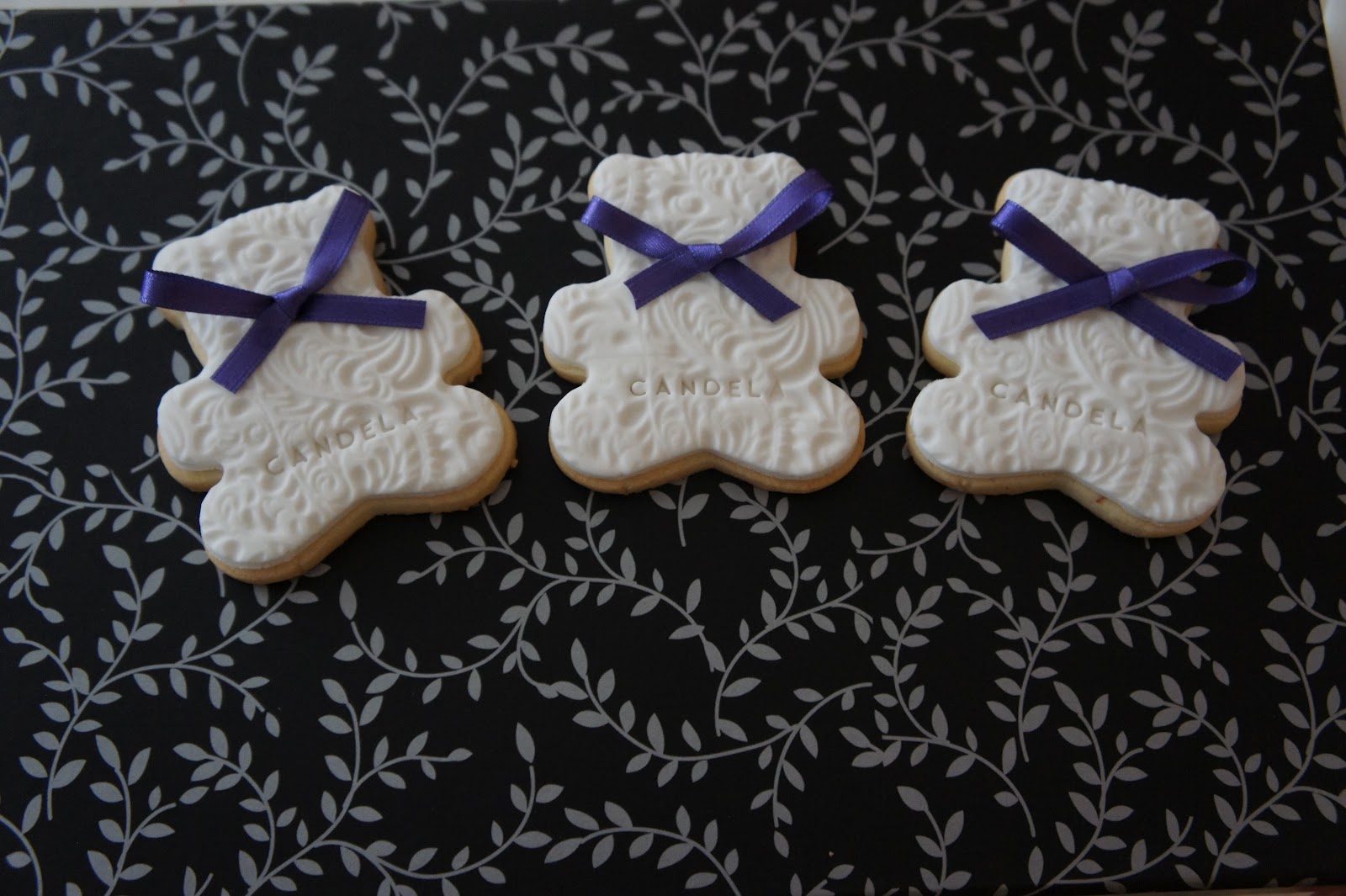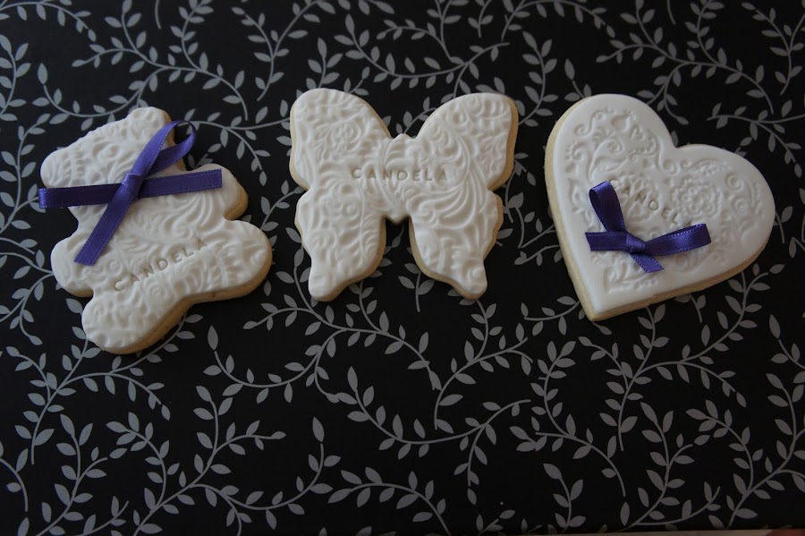 Después de cruzarnos varios emails, decidimos que los tonos para estas galletas serían blancas y lila (aunque las fotos las saque tarde y por la luz los lacitos parezcan azules) y las formas: ositos, corazones, conejitos y mariposas.