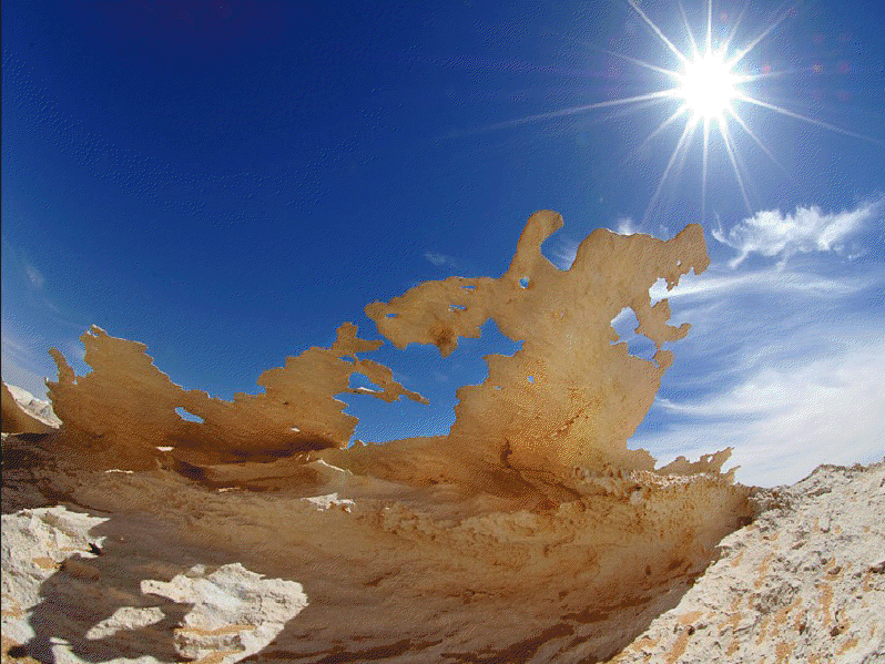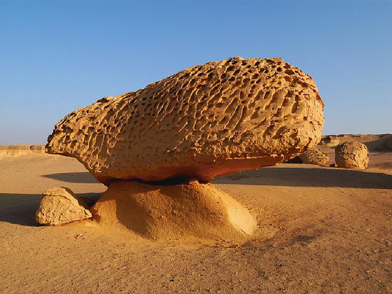 Este lugar es muy popular por sus inusuales formaciones rocosas. El blanco-nieve de las rocas es en realidad tiza o yeso que ha estado expuesta durante años a lo que los geólogos llaman "meteorización diferencial," la erosión de las partículas suaves que resultan en misteriosas protuberancias de la roca dura. Estos hongos son formaciones rocosas, de diez a 20 metros de altura, cuyas bases de piedra caliza se ha desgastado lejos por la arena y viento que ha soplado contra ellos a altas velocidades durante miles de años.La meteorización ha creado formas como cúpulas, minaretes, castillos, torres y así sucesivamente. Llama la atención encontrar fósiles marinos incrustados en la tiza, hace millones de años toda esta zona era un mar interior.