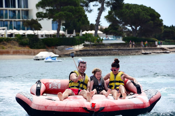 Como digo, no podré repetir en un hotel con esos precios en mi vida, pero ¡"Qué me quiten lo bailao"! Y al día siguiente desayunábamos en nuestro aparta hotel mucho mas modesto pero que igualmente nos iba a permitir disfrutar de lo que ofrece la isla, como montar en esta divertidísima colchoneta ¡A todo gas! por aguas ibicencas.......y de repente al día siguiente va y aparece Atzaro en nuestras vidas.