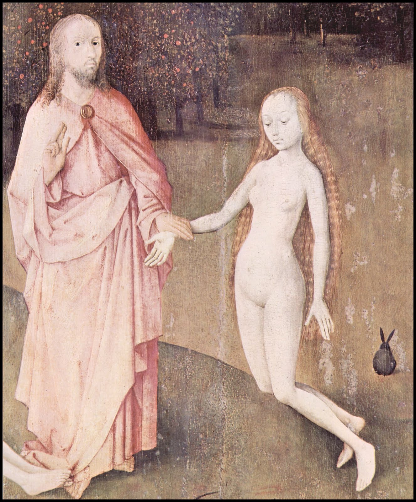 En la parte inferior de la tabla se pueden apreciar otros dos elementos simbólicos. Concurren varios personajes. Uno de ellos, el único, por cierto, que aparece vestido en todo el cuadro, mira claramente hacia afuera estableciendo una complicidad con el espectador. Señala a una mujer tumbada que a todas luces parece ser Eva. Detrás del hombre vestido irrumpe un tercer personaje. Acerca de quien es el hombre vestido hay varias teorías. Bax, por ejemplo, lo identifica con Adán mientras que el hombre que aparece por detrás saliendo de una cueva sería Noé anunciando una nueva era tras el diluvio. Mateo tiene otra teoría. El varón pertrechado es Juan Bautista, que siempre se representa con una piel deshilachada y señalando siempre algo, el Cordero normalmente. Aquí, sin embargo, El Bosco nos sorprendería una vez más. El Bautista no aparece señalando al que quita los pecados del mundo (el Cordero) sino precisamente a la que los trajo, Eva. La cueva por la que irrumpe San Juan sería el símbolo de entrada en el limbo tal como se describe en el evangelio apócrifo según Nicodemo. San Juan encarnaría de esta forma el gozne entre el mundo anterior al pecado y el mundo terrenal. Por otro lado, hay otra obra interesante de San Agustín, Comentario al Génesis contra los maniqueos, en la que el célebre autor señala que la muerte está fijada en la túnica de pieles: «Ellos se habrían cubierto de hojas y Dios les entregó túnicas de pieles, los cubrió con la mortalidad de esta vida». Este significado es el que hace pensar a los estudiosos que debajo de esa túnica se encuentra la pareja original. Desde la cueva se convierten en testigos de lo que sobrevino al mundo por su culpa. Además, en la esquina inferior izquierda, hay un grupo de hombres que están señalando hacia la tabla anterior, en especial a Eva, lo que se ha interpretado como una clara acusación a la mujer como responsable de haber sucumbido a la tentación de la serpiente cometiendo el pecado por el que pagará toda la humanidad. La misoginia en la época en la que El Bosco pinta el Jardín de las delicias es de sobra conocida. Erasmo hablaba de la necedad de la mujer señalando que ésta sólo servía para procurar placer al hombre el cual también rozaba la necedad cuando las buscaba.