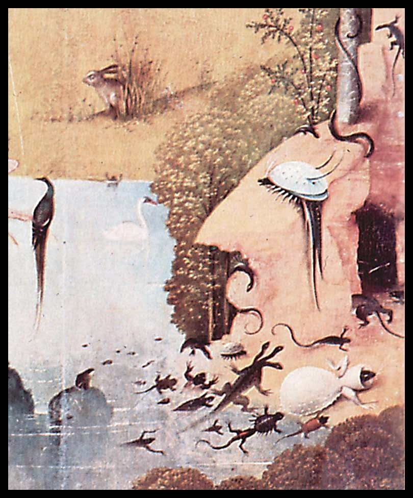En lo que a primera vista parece el típico Edén, asociado a la idea de paz y sosiego, con poco que observemos, ese idílico escenario se ve truncado. Varios signos de hostigamiento irrumpen, los animales se enfrentan unos a otros: un león derriba a un ciervo y se dispone a comerlo, un extraño bípedo es perseguido por un jabalí. En el estanque, las disputas entre los animales vuelven a reanudarse: un leopardo lleva en la boca un ratón, un ave devora una rana. Son señales ajenas a la paz paradisíaca que suelen interpretarse como aviso de pecado.