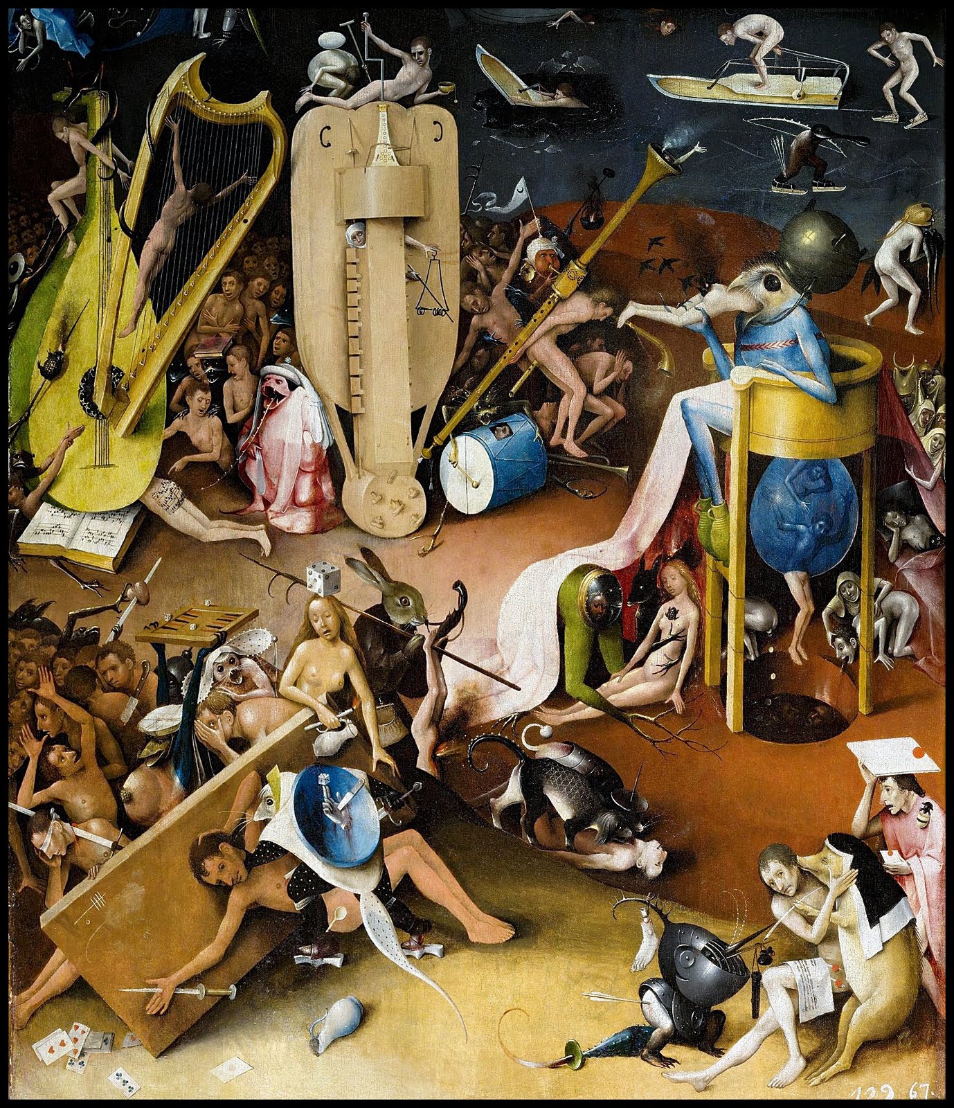 También es conocido como El infierno musical, por las múltiples representaciones de instrumentos musicales que aparecen. Se ignora por qué El Bosco asocia la música con el pecado. Ha pintado los tormentos del infierno, a los que está expuesta la Humanidad. Describe un mundo onírico, demoníaco, opresivo, de innumerables tormentos.2 Es una tabla muy sombría en relación con el colorido de las otras dos: tonos lívidos del infierno de hielo, vivas llamas del infierno de fuego.1 La tabla se puede dividir en tres niveles.