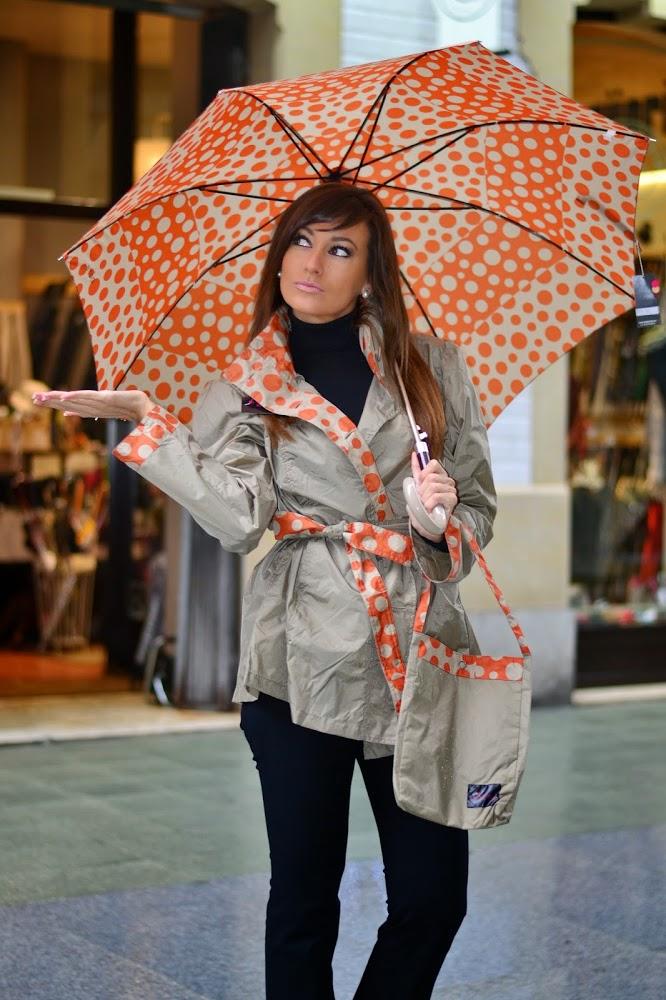 Como una de las señas de identidad de Dots & Squirrel son los lunares, una temporada más, esta firma asturiana ha vuelto a sacar una innovadora línea de chubasqueros a juego con paraguas (en versión larga y/o plegable) en los mismos tejidos, como este de topitos naranjas sobre fondo beige y viceversa (disponible aquí).