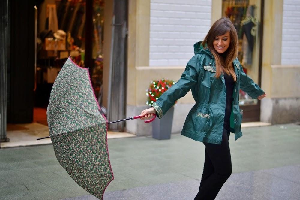 Si os gustan más los estampados florales, también existen varias opciones, como este original conjunto de chubasquero con capucha, en liso, con detalles de flores en los puños y bolsillos, por supuesto, a juego con su paraguas (disponible aquí).