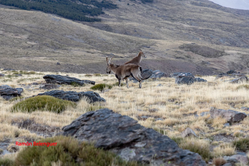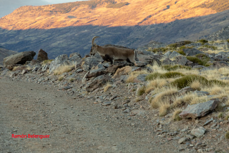 Al día siguiente nada más salir del refugio camino de Capileira vienen a despedirse un grupo de machos de Cabra montesa, Capra pyrenaica