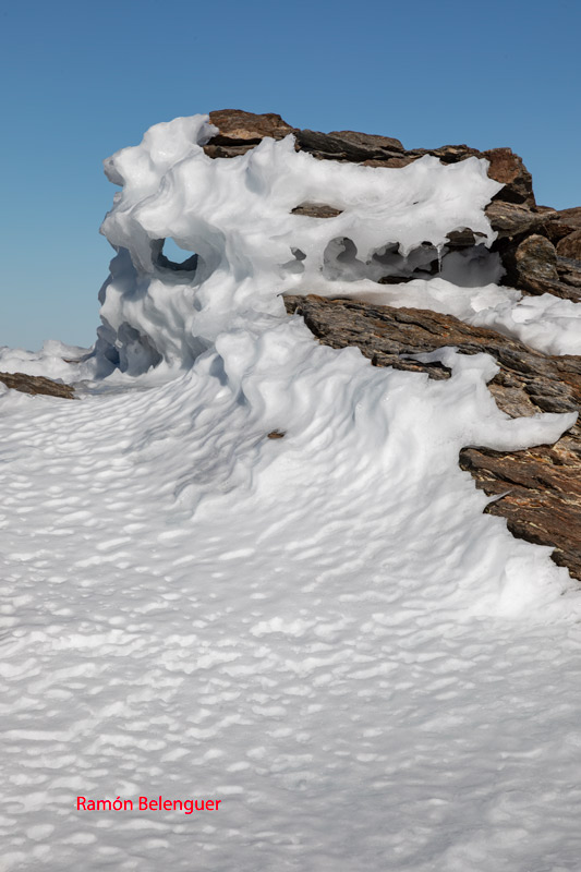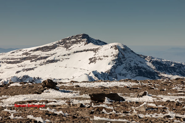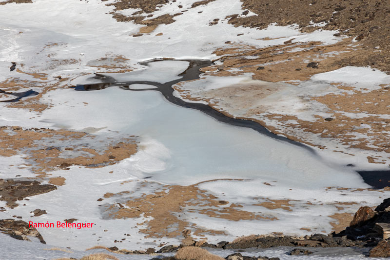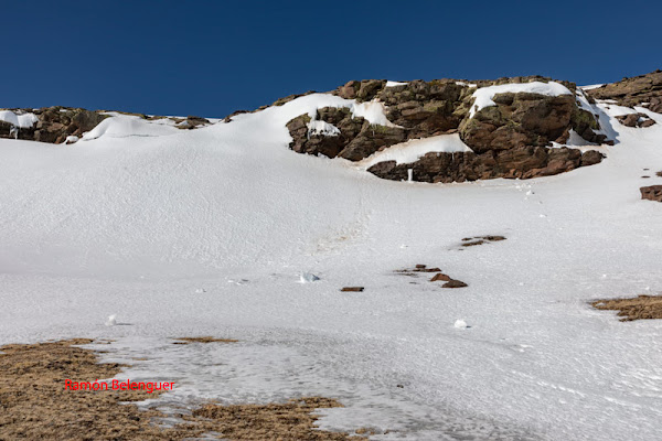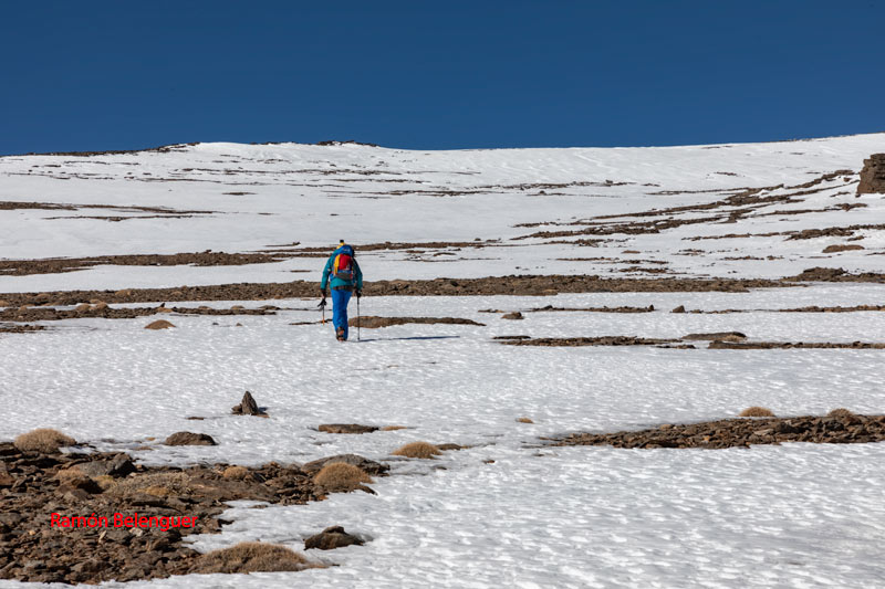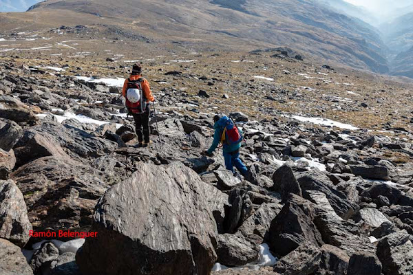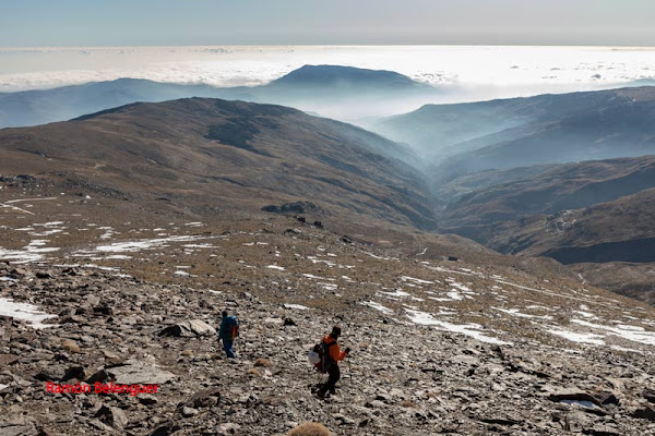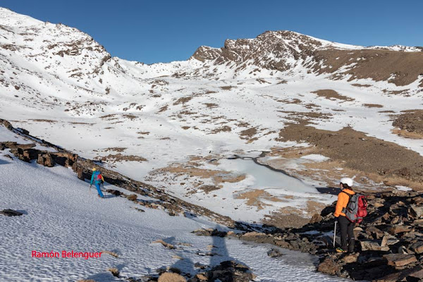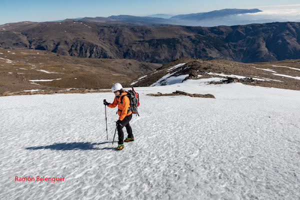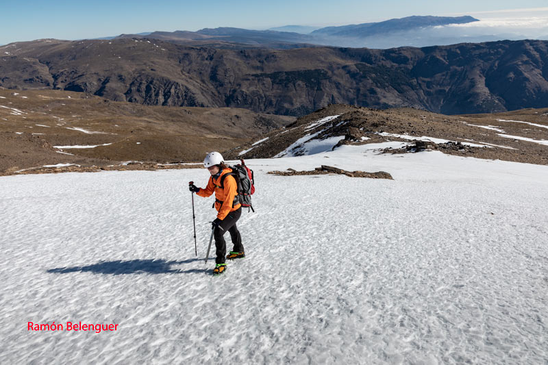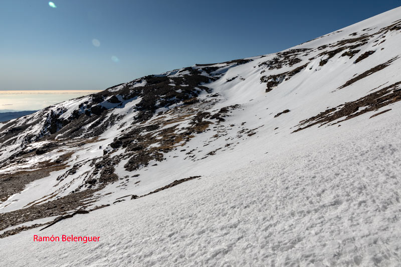 Buscando un camino para bajar a Siete Laguas, ante la imposibilidad por el hielo y la pendiente, decidimos volver atrás y atacar el Mulhacén