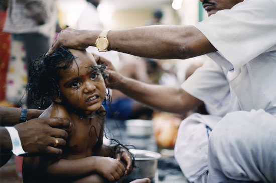 Niña rapada en el templo de Tirumala