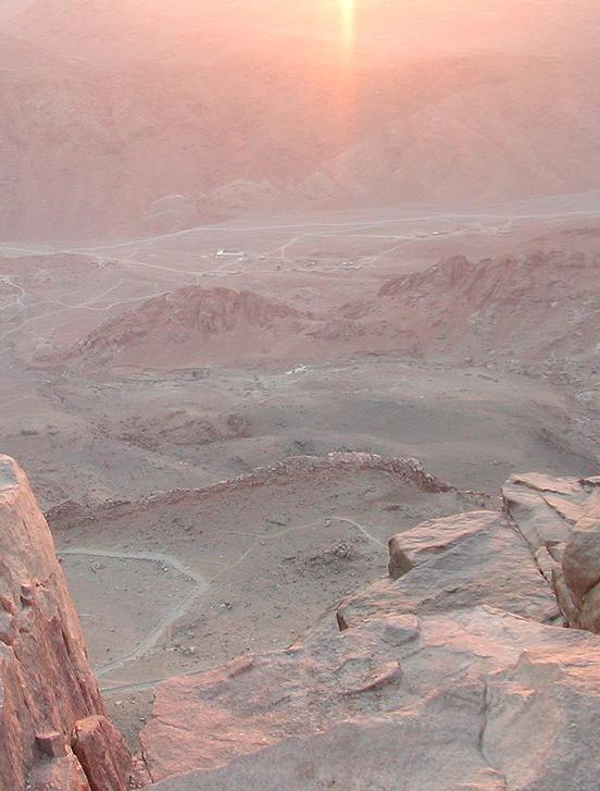 La subida es penosa porque para ver bien lo que realmente esconde este lugar extraño y perfecto y para tener una visión divina, hay que estar arriba cuando el sol sale por el horizonte; es entonces cuando nos damos cuenta de que Algo hay que pone orden para que ocurra de esta manera. Quizás sea uno de los lugares que más no acerquen a Dios o como quiera llamarse esa fuerza que coloca cada cosa en su sitio y que haga transcurrir cada segundo según un orden establecido. Sinaí o Gebel Musa en árabe, es casi un camino de iniciación cuando se va con el afán de encontrar algo… quizás una piedra donde reposar aunque el camino de subida sea todo un maratón que comienza sobre las dos de la madrugada desde el pueblo Al Milga que está muy cerca del monasterio de Santa Catalina. La clave para salir a esta hora es hacer coincidir la salida del sol cuando ya se está en la cima. No hay más, solamente hacernos ver una de las cosas más bellas del mundo natural.