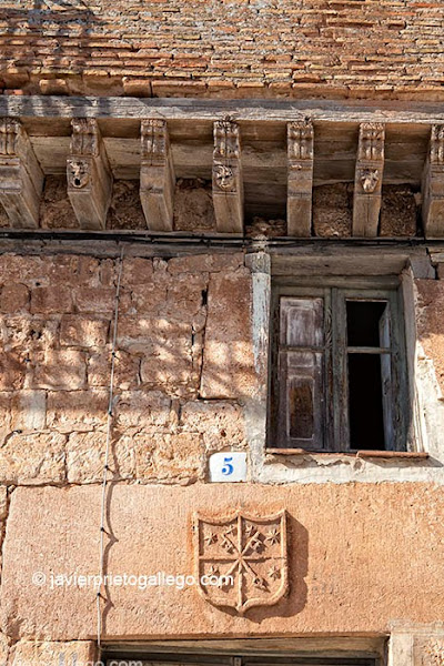 Casa que pudo habitar la reina Juana en el viaje con el cadáver de su esposo hacia Torquemada. Sobre la ventana destacan los canecillos labrados sobre las vigas de madera. Localidad de Presencio. Castilla y León. España © Javier Prieto Gallego