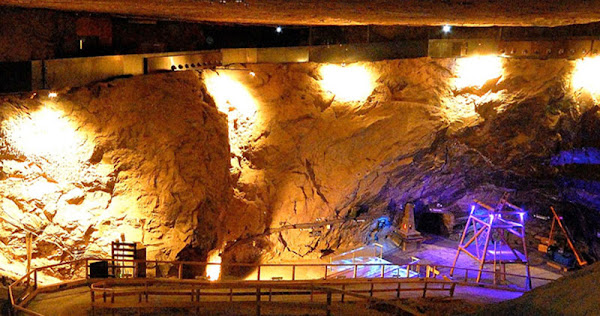 Para acceder a las galerías, recorreremos cerca de un kilómetro subidos a una especie de tren con varios vagones, que va sobre los raíles utilizados por las mismas vagonetas que se utilizan para transportar material extraído. Aunque el espacio del túnel de acceso es bastante estrecho, no da ninguna sensación de claustrofobia (y eso que yo tengo un poquito en según qué situaciones). Al llegar al interior de la galería, comienza la visita en sí, donde veremos grandes cavidades excavadas similares a la que podéis ver en la portada de este post.