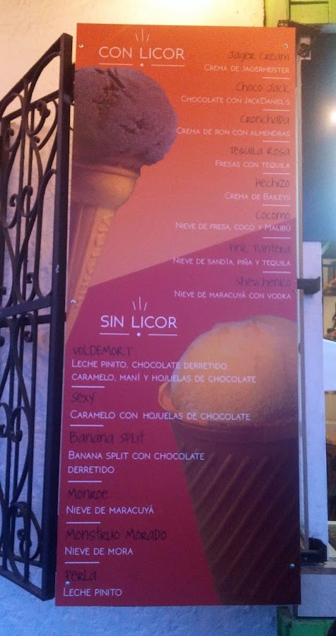 Pero...¿Qué tienen de especial estos helados? Pues la combinación de sabores y que tienen una gama de ellos con licores. Si eres como yo que no toleras mucho el alcohol y no estás seguro que tan fuerte sea el sabor, puedes pedir que te den a probar alguno de ellos. Yo pude probar el que llaman “Hechizo” que tiene una pequeña cantidad de Baileys y me encantó. Mauricio pidió el famoso “Meteoro” y aunque no me gusta para nada el whisky les puedo decir que tiene la cantidad exacta para poder degustarse con agrado.