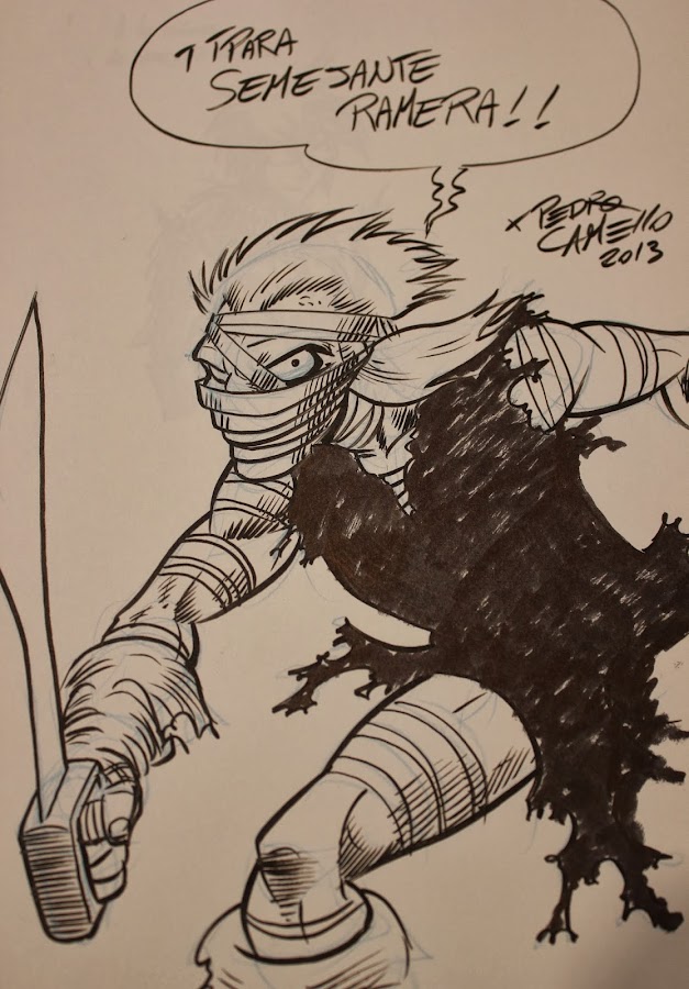 No tenemos tiempo para más, pues Pedro Camello tiene que atender firmas de sus ejemplares en el stand de la editorial Aleta. Sin embargo, dedica con cariño un dibujo de Treyes al blog. Un lujo de entrevista y de regalo.