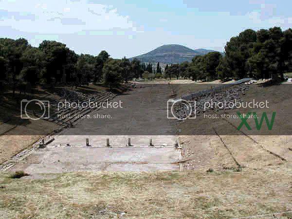 Bajando por la parte orientada al sur llegamos hasta el Estadio, obra del quinto siglo a. JC, tiene 181 metros de longitud y sus gradas están talladas en el suelo. Su forma nos recuerda al estadio de Olimpia, pero más pequeño.