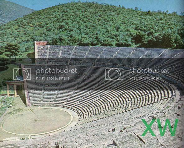 A medio kilómetro se encuentra el teatro, la joya del lugar. Al pie del monte Kynortion es el mejor conservado de los teatros griegos antiguos. Fue construído en el siglo cuarto A.JC por Polícleto el joven. Su graderío está formado por dos partes; la inferior y la superior. Su forma es totalmente semicircular y en un principio la parte inferior era la única que existía, mientras que la parte superior le fue añadida mucho después. La parte inferior está divdida en 13 escalones y doce rincones (llamando así a los ángulos que formaban en su terminación). La zona superior consta de 23 escalones. Tanto la orquesta de forma circular como los coros y el escenario tiene un diamétro de 10 metros y el suelo es de tierra batida. La estatua del dios Dionisios se encontraba en el centro del escenario. En lo que forma su decorado o fondo de escenario aún podemos ver las altas pilastras, el pórtico ornamental, las medias columnas y columnas que sostenían el inmenso fondo que servía de escenario para las grandes obras trágicas. La capacidad del teatro es de 15.000 a 17.000 espectadores. En la actualidad se siguen representando obras clásicas griegas en su recinto.