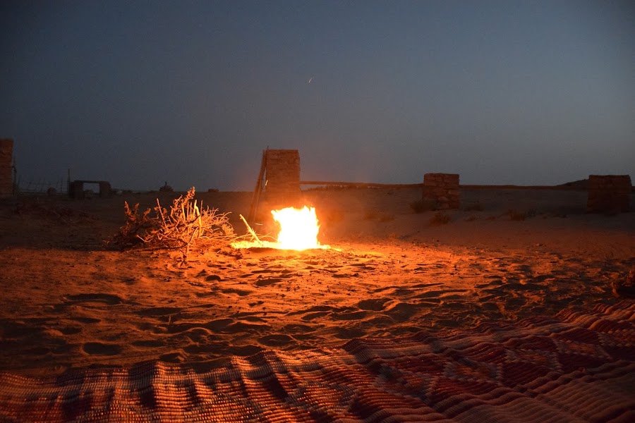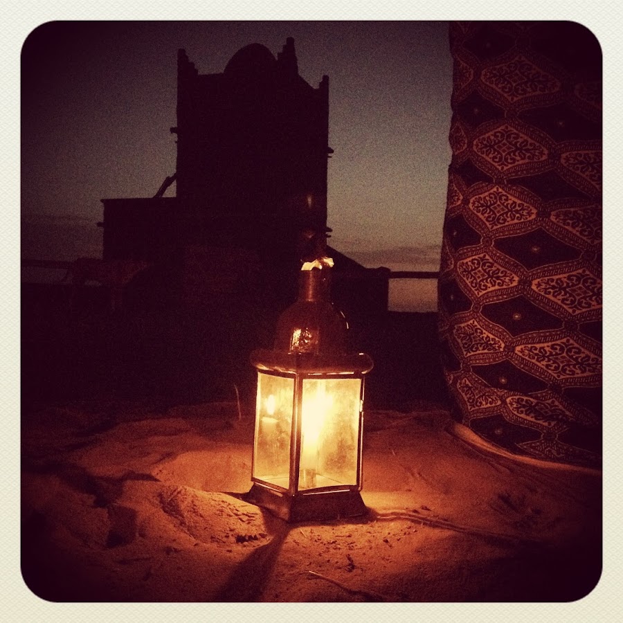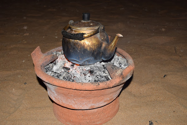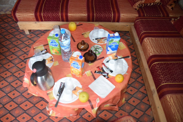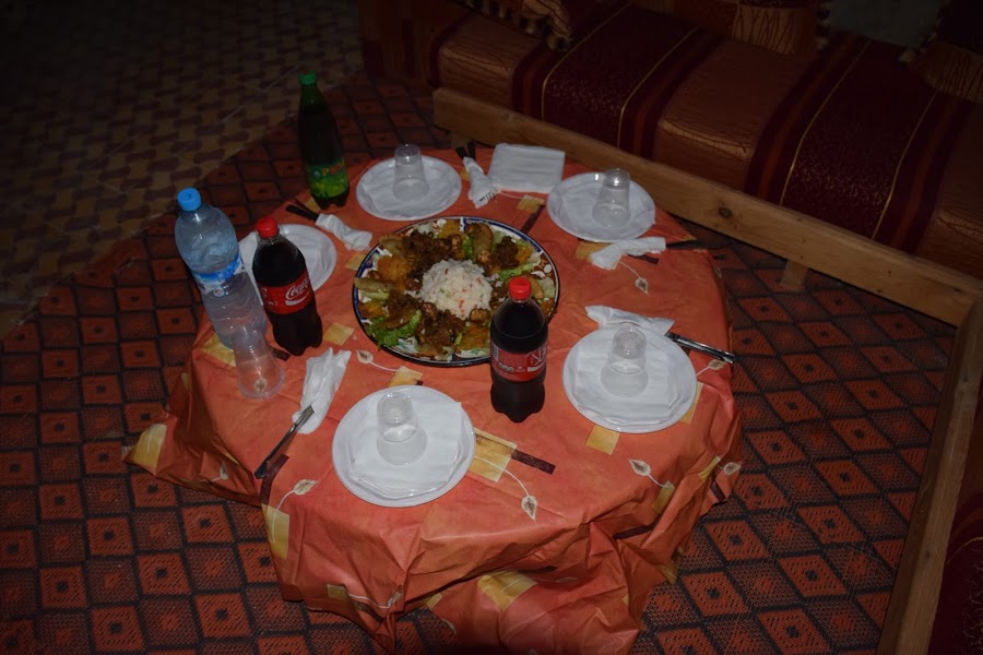 Desgraciadamente el viento no quería dejar de soplar, por lo que la experiencia en la jaima la cambiamos por dormir en la torre, al abrigo del frío del desierto. Cuando cayó la noche nuestro guía y el encargado del campamento nos sirvieron un delicioso tajine de carnero, acompañado de otras especialidades locales realmente deliciosas y a continuación, con el viento ya calmado, pasamos a la media jaima donde asistiríamos a la ceremonia del te beduino mientras hablábamos de la jornada bajo un espectacular dosel de estrellas. Inolvidable.