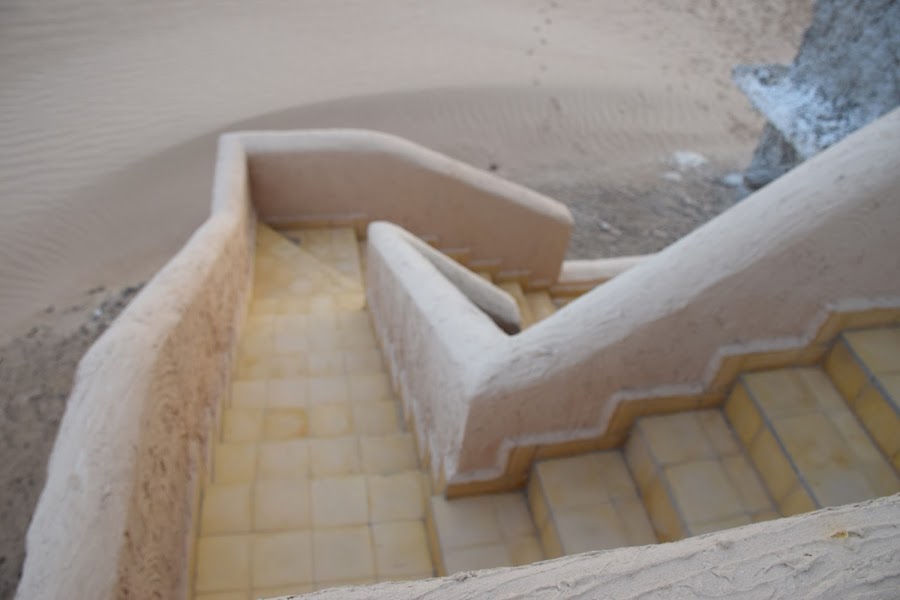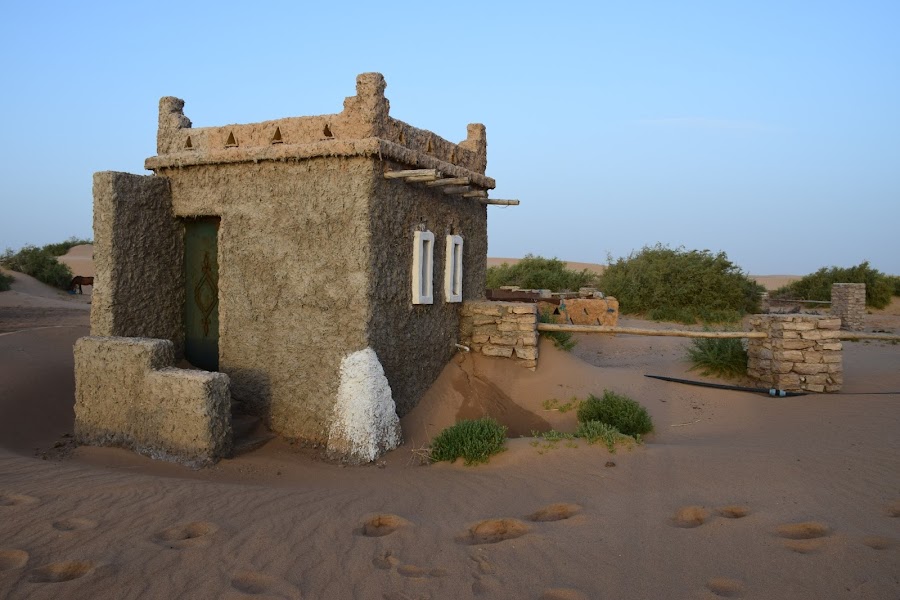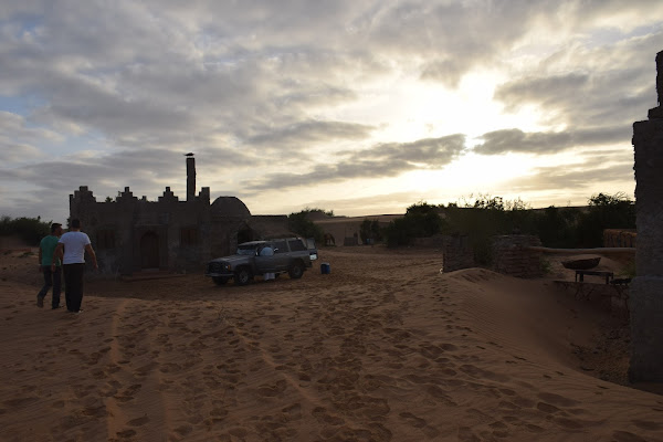 Nuestro conductor y guía, Ali Salem, nos recogió en el aeropuerto y tras llevarnos a comer y cambiarnos algo de moneda para nuestros gastos, nos condujo directamente al desierto, donde pasaríamos la noche. Tras seguir la carretera hacia el sur, nos desviamos por una pista casi invisible para nosotros hasta llegar a un emplazamiento rodeado de palmeras, arbustos y sobre todo mucha agua. Allí, Paco ha construido una pequeña aldea con servicios básicos, donde pasaríamos la noche. Un pozo donde abrevan caballos, camellos y un perro juguetón, una torre de estilo bereber, y varias construcciones que hacen funciones de cocina, comedor y despensa conforman el lugar donde pasaríamos la noche.