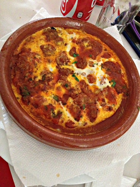 Después de pedir los principales, llegaron los aperitivos, una aceitunas verdes muy picantes y aderezadas que nos hicieron sudar de lo lindo y beber mucho refresco de cola. Luego llegaron dos Kefta que es carne picada aderezada con piñones, cebolla, ajo, perejil, pimentón picante, cominos y aceite de oliva, que se sirve de diferentes formas y todas están buenísimas, y dos tajines de carne de....¡camello!.