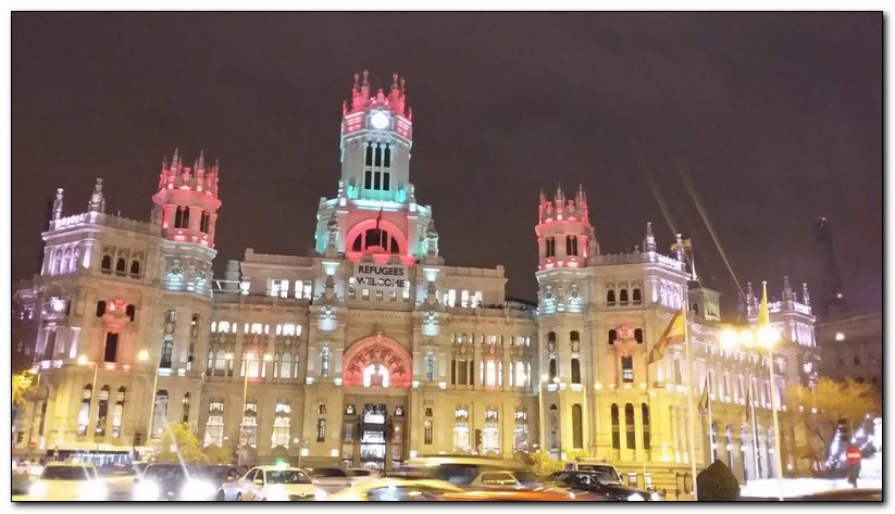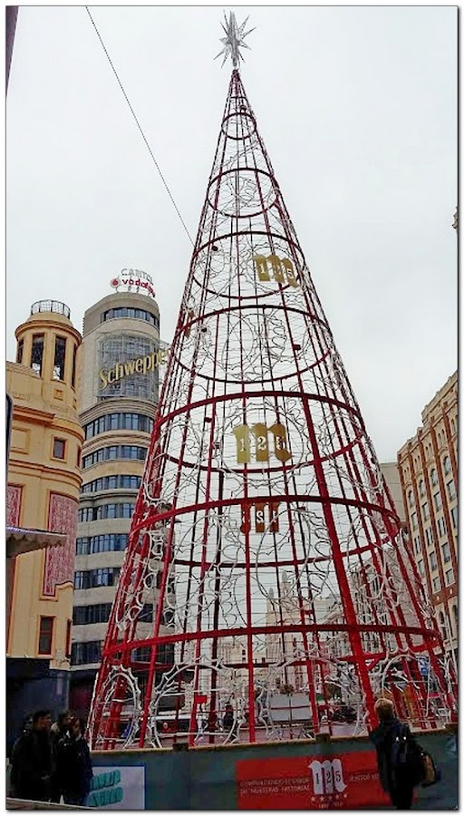 Y ya en la noche navideña de Madrid vemos un Palacio de la comunicaciones y la Fuente de Cibeles llenas de luz y color al igual que sus calles.