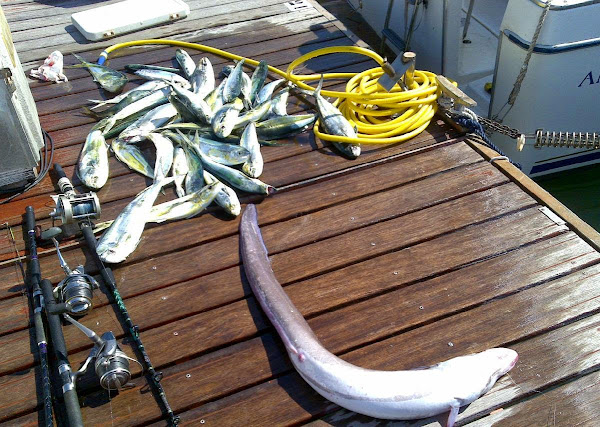 Pesquera del 01-11-2006: llampugas de buen tamaño (de 1,5 a 4 kg) capturadas a jigging, junto a un puñado de seriolas y calamares.