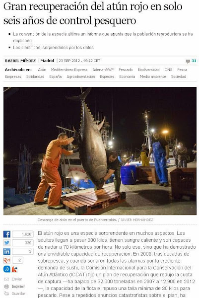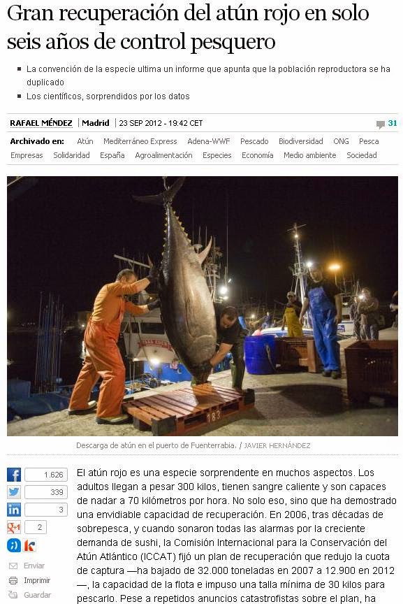 El plan de recuperación del atún rojo, reduciendo las cuotas de captura desde el 2006 ha sido un éxito. Uno de sus efectos colaterales puede ser la disminución de las poblaciones de otras especies que compiten con él por el alimento (LLAMPUGA), o constituyen sus principales fuentes de alimento (calamar, etc).
