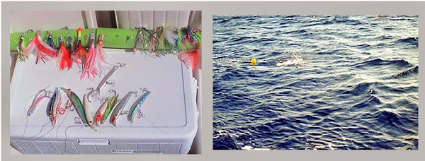 A la izquierda: técnica del curricán (señuelos para llampugas: pulpitos y rapalas). A la derecha: acción de pesca a "drifting" (a media agua) con globos para separar las líneas de la embarcación.