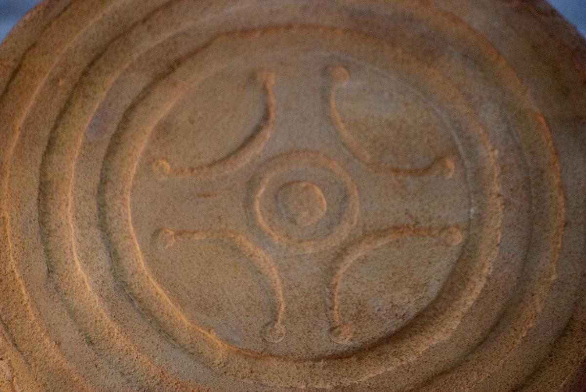 Por una de las caras tiene un círculo rodeado de cuatro lunas crecientes enfrentadas de dos en dos en forma de cruz (similar a la estela de Barros), inscritas en tres circunferencias.