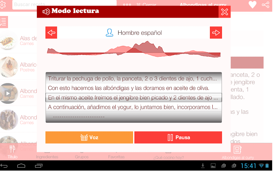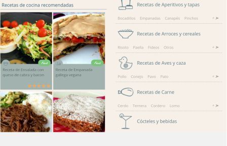 puedes cocinar con los ingredientes de los que dispones) y grupos de recetas (postres,