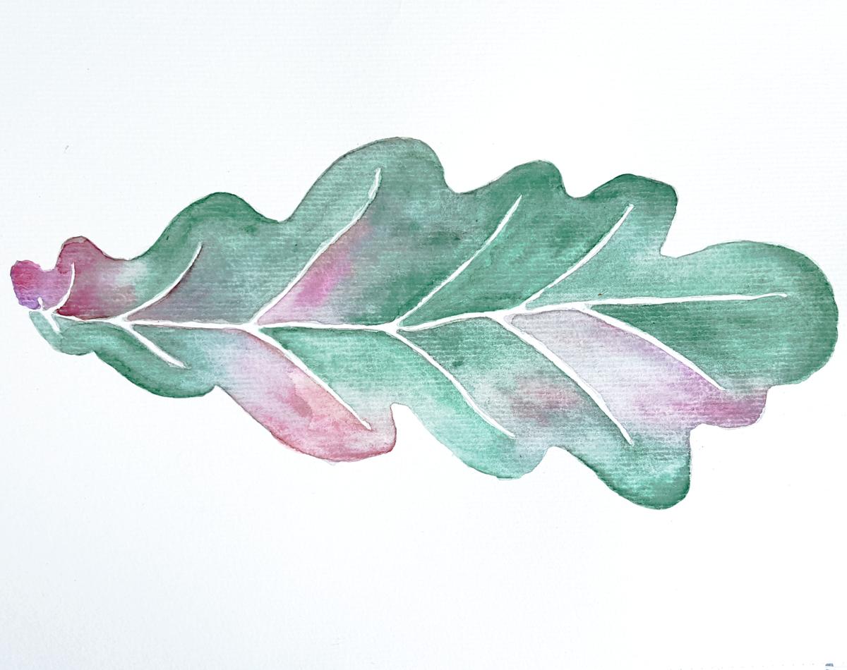 Al igual que hemos seleccionado una flor principal, también hemos seleccionado un tipo de hoja principal. En este caso es la hoja de roble, porque me parece muy interesante la forma ondulada que tiene. Para que sea más estética y darle un toque de fantasía, la hemos pintado en dos colores: color verde y color morado, y hemos dejado los nervios de color blanco.