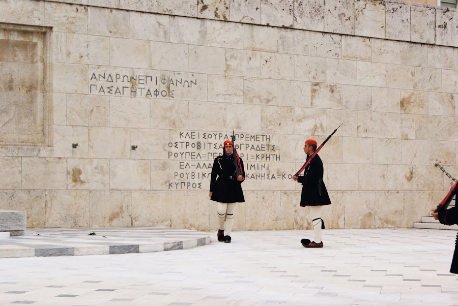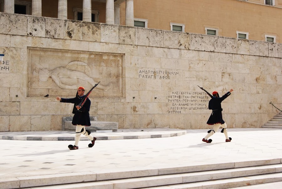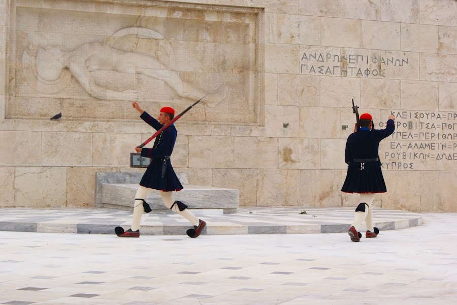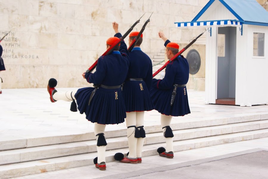 Loa evzones componen la guardia elegida para velar por la sagrada tumba y el palacio del Parlamento. Llaman mucho la atención por su tradicional uniforme de falda corta y zuecos con pompones.