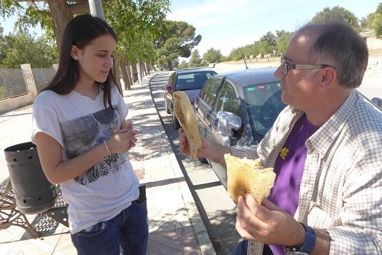 Pudimos ver con nuestros propios ojos cómo es la vida del interior de la colmena, cómo es su organización, cómo crían nuevas abejas y cómo fabrican las realeras de las que salen las abejas reina. También vimos cómo almacenan la miel y el polen y cómo Pascual organiza las colmenas para que su desarrollo sea el adecuado así como la producción de miel.