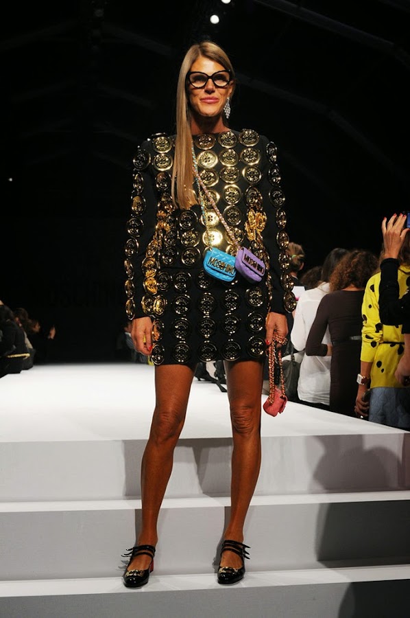 Anna Dello Russo con 1, 2, 3 bolsos de Moschino en Moschino.